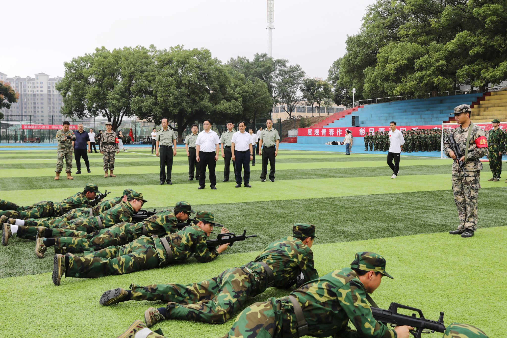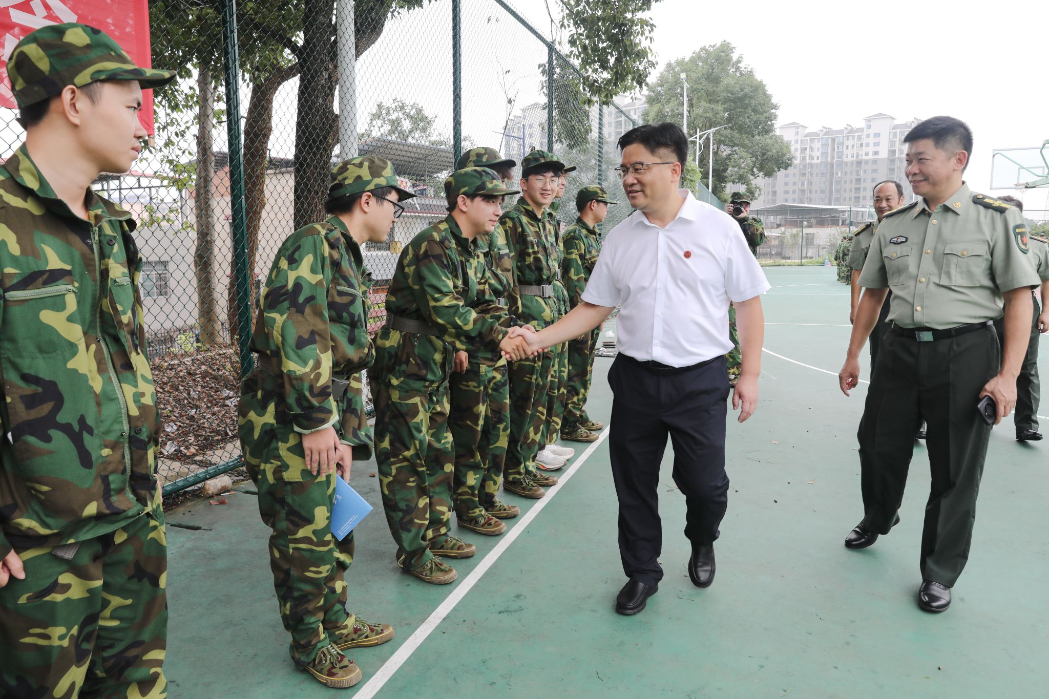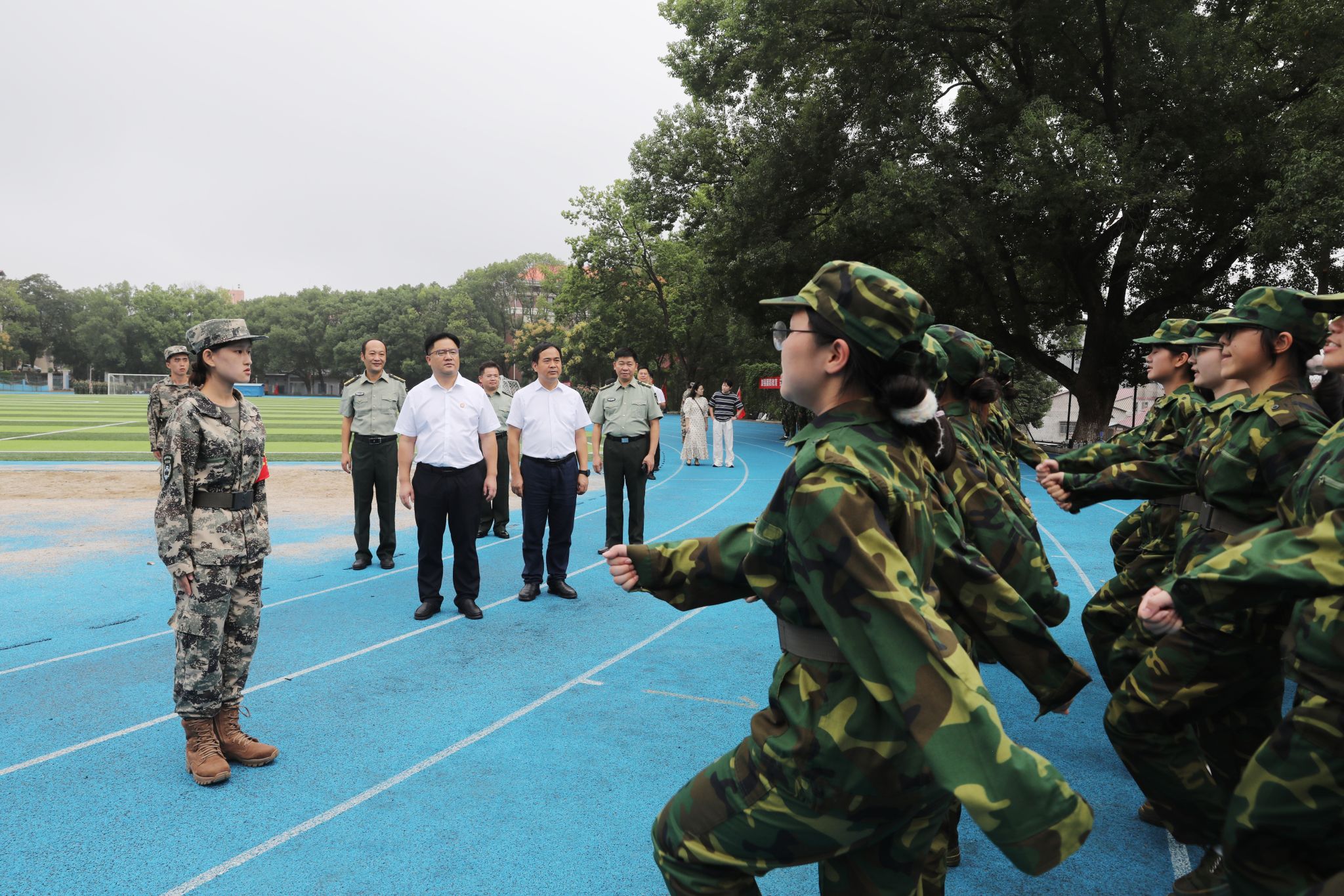 校领导一行不时驻足观摩各连队的训练风采,看望慰问教官和参训师生,并与他们亲切交谈,对教官们的辛勤付出表示衷心的感谢,希望全体教官要严密组织、科学施训,圆满完成军训各项任务。