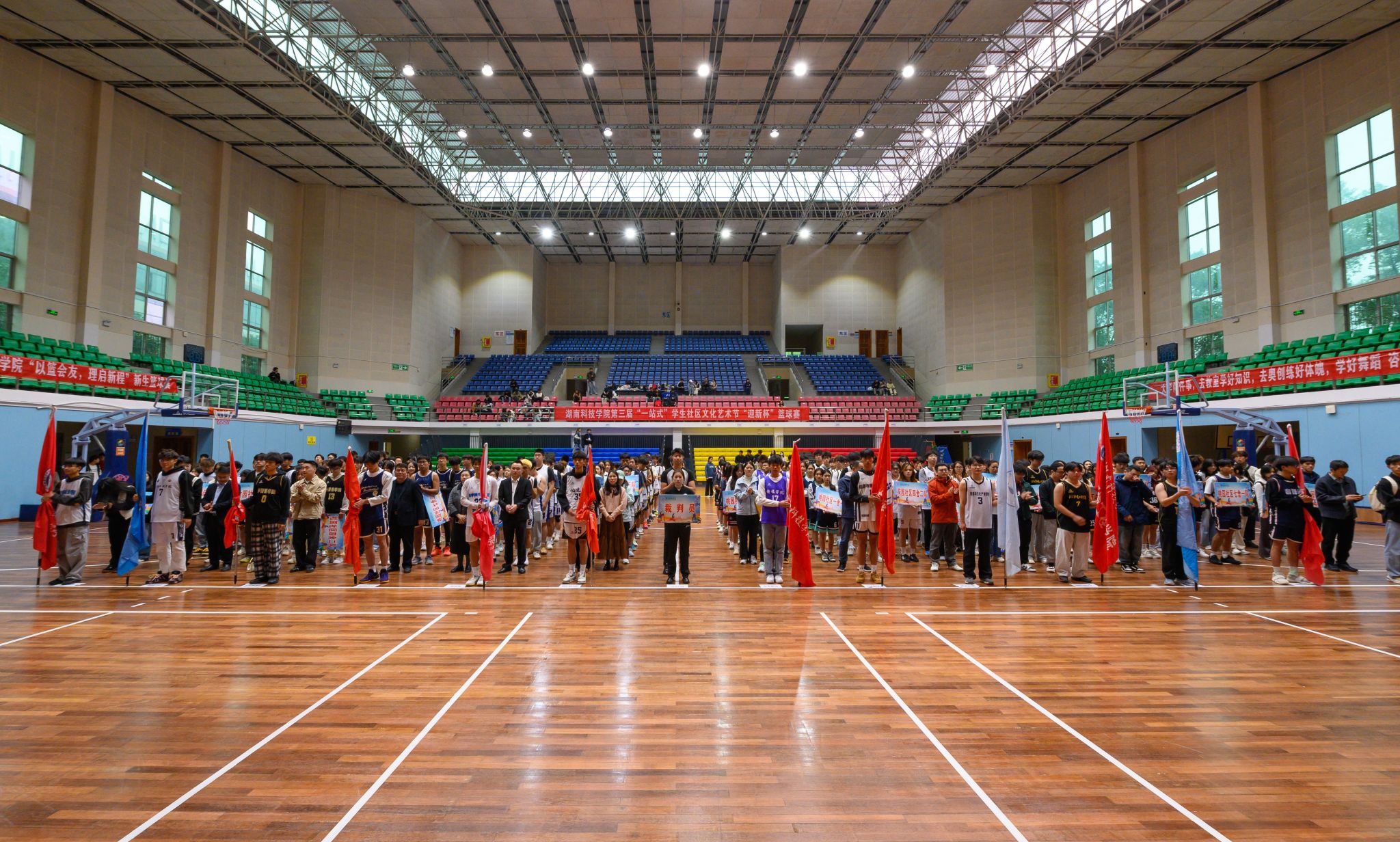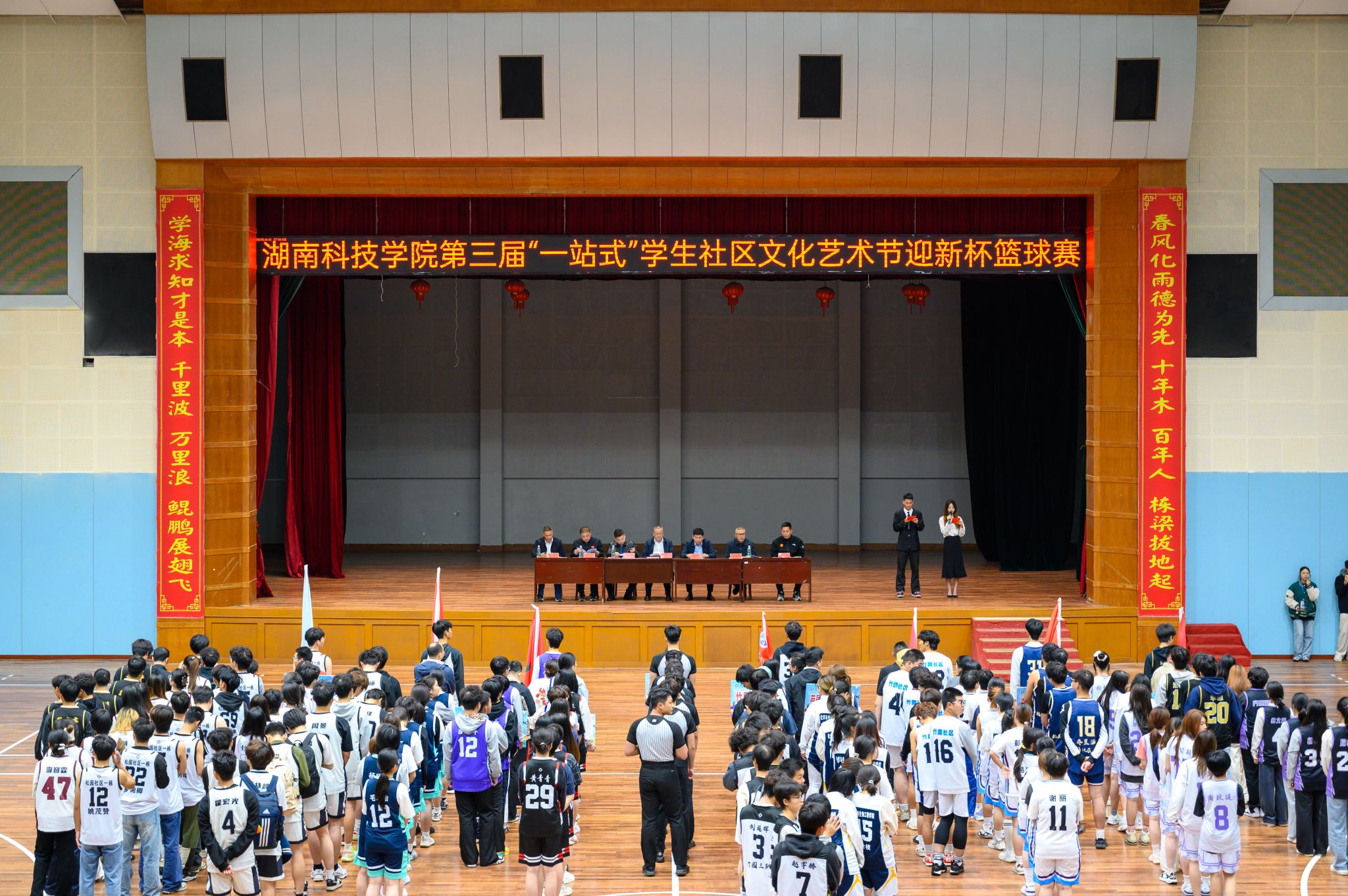 本网讯(记者 万湘徽 摄影 杨芊澍)11月11日,学校体育馆内人声鼎沸、气氛热烈,第三届“一站式”学生社区文化艺术节“迎新杯”篮球赛正式开幕。校党委委员、副校长何福林,党委委员、组织部部长杨涛出席活动,学生工作部、校团委、体育学院负责人,以及全校各学生社区参赛学生代表齐聚在现场,共同见证赛事启动。