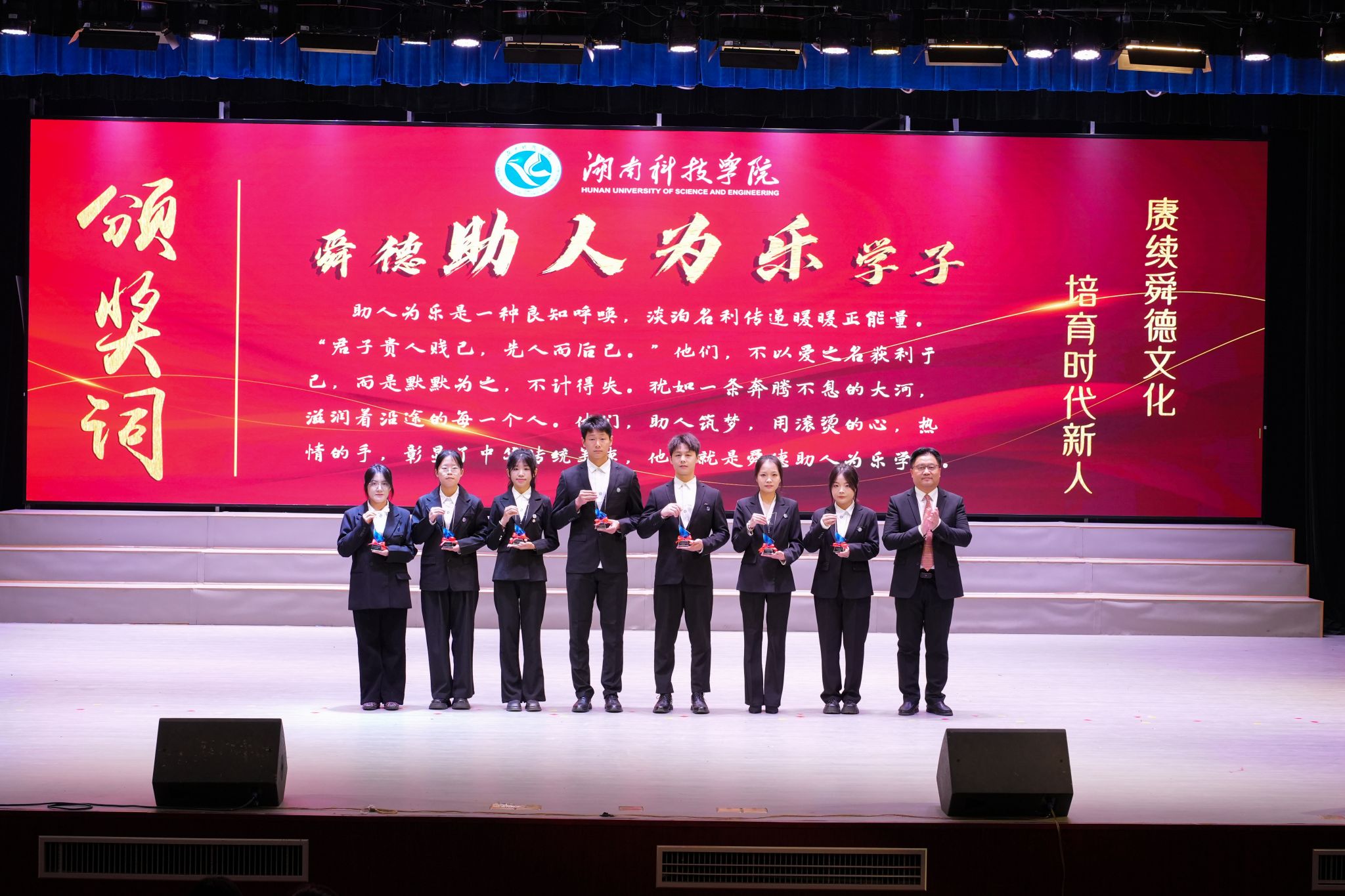 “助人为乐学子”杨叶,以平凡善举,为他人倾尽热忱传递温暖,诠释助人为乐的真谛;“自立自强学子”李科俊,以自强为剑,劈开前路的荆棘,用坚韧步伐踏响青春的强音;“谦恭知礼学子”段婵,将谦恭知礼内化于心、外化于行;“孝老爱亲学子”孙涛,以孝为灯,守护至亲,躬身爱家写担当;“诚实守信学子”张胜蓝,以点滴行动诠释诚实守信,彰显新时代大学生高尚的品格;“无私奉献学子”赵润琨用不求回报的付出,让梦想绽放,让希望绵延……每位“舜德学子”的故事虽不尽相同,却感人至深,催人奋进。