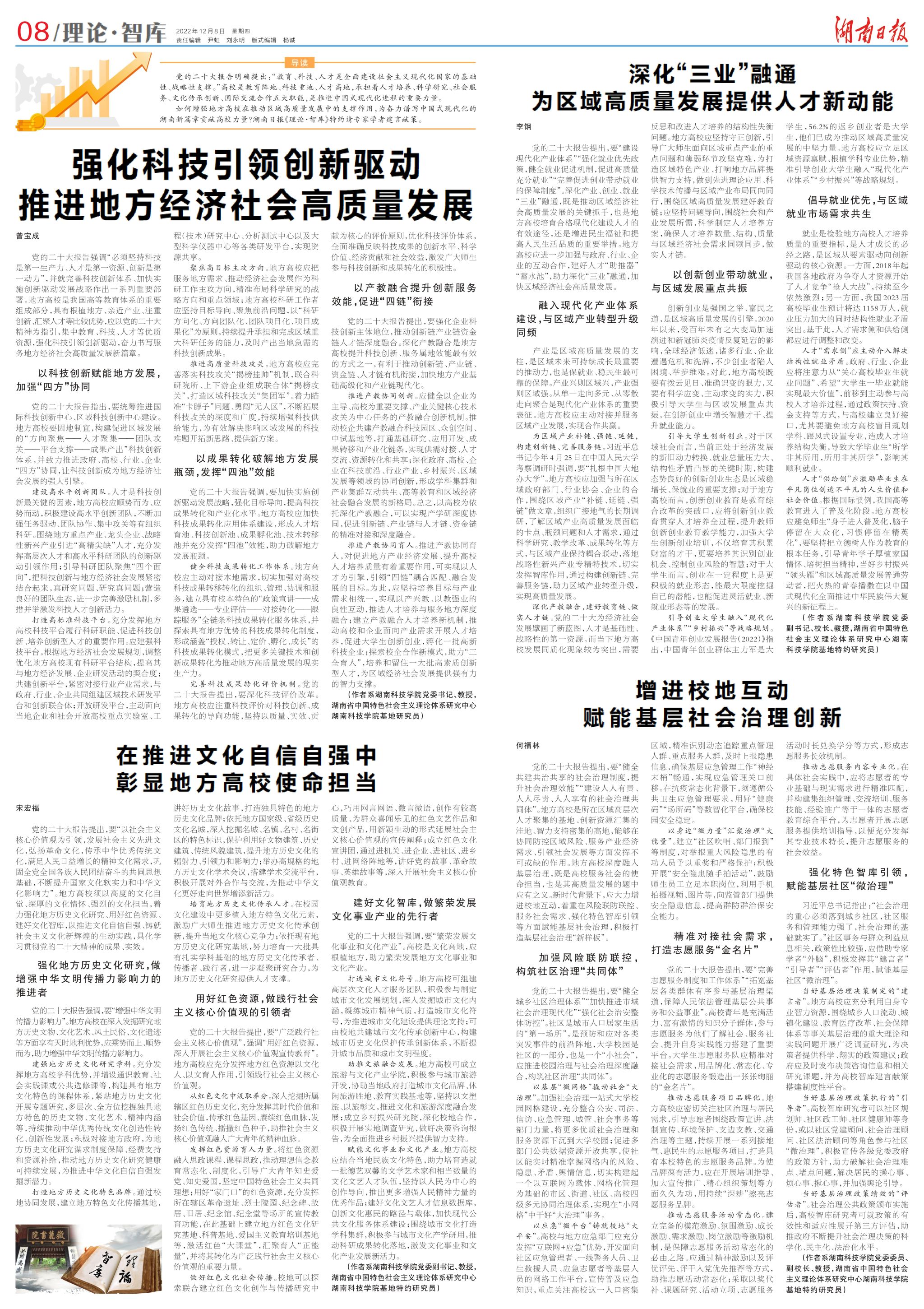 党的二十大胜利召开后,学校迅速掀起学习宣传贯彻热潮。2022年12月,《湖南日报》整版刊发我校领导班子成员系列理论文章。
