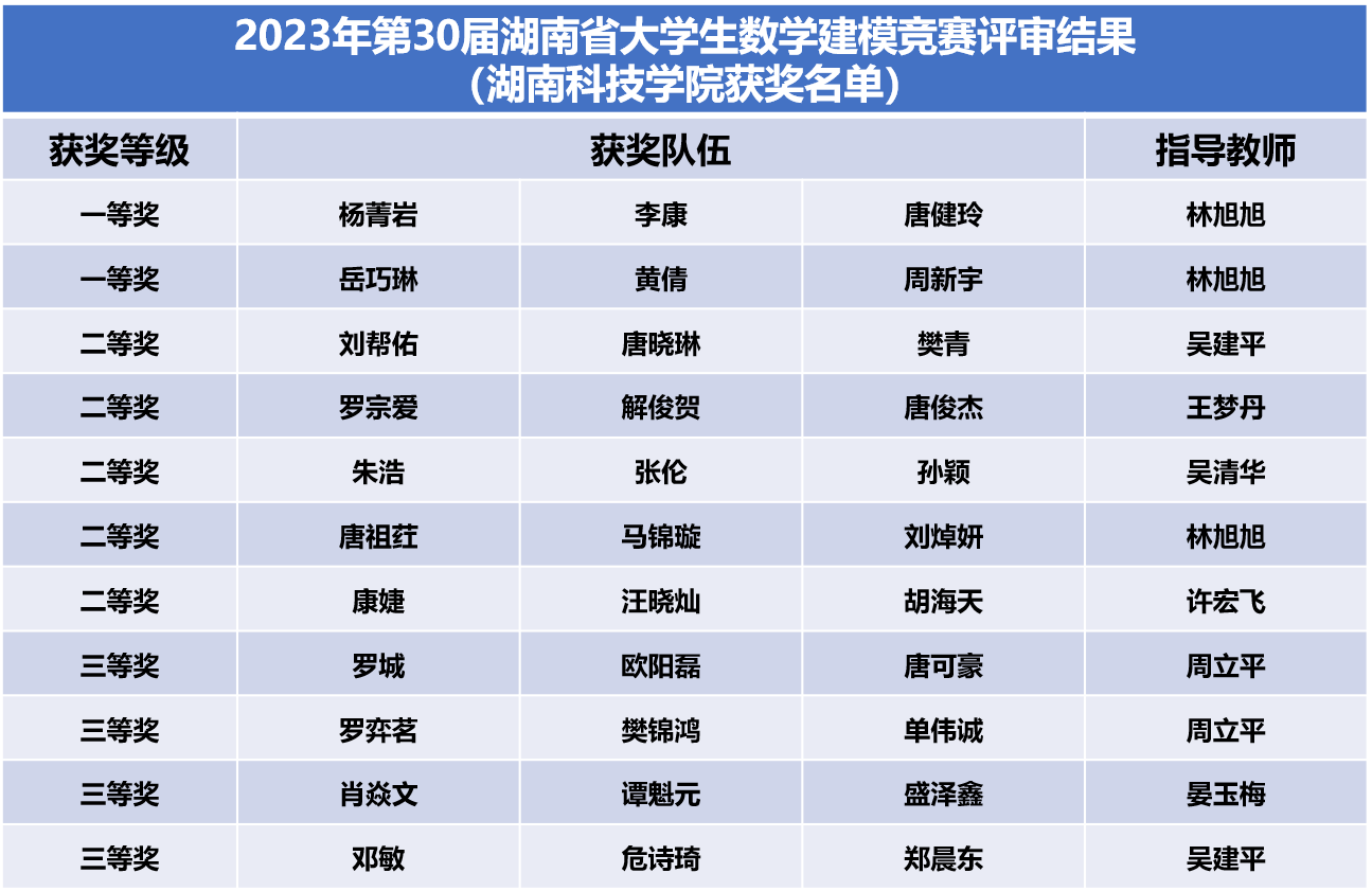 本网讯 近日,由湖南省教育厅主办的2023年湖南省大学生数学建模竞赛暨全国大学生数学建模竞赛湖南赛区比赛获奖揭晓。理学院代表队荣获省一等奖2项,二等奖5项,三等奖4项,获奖数创该项赛事历年新高,理学院林旭旭老师被授予2023年湖南省大学生数学建模竞赛优秀指导教师。