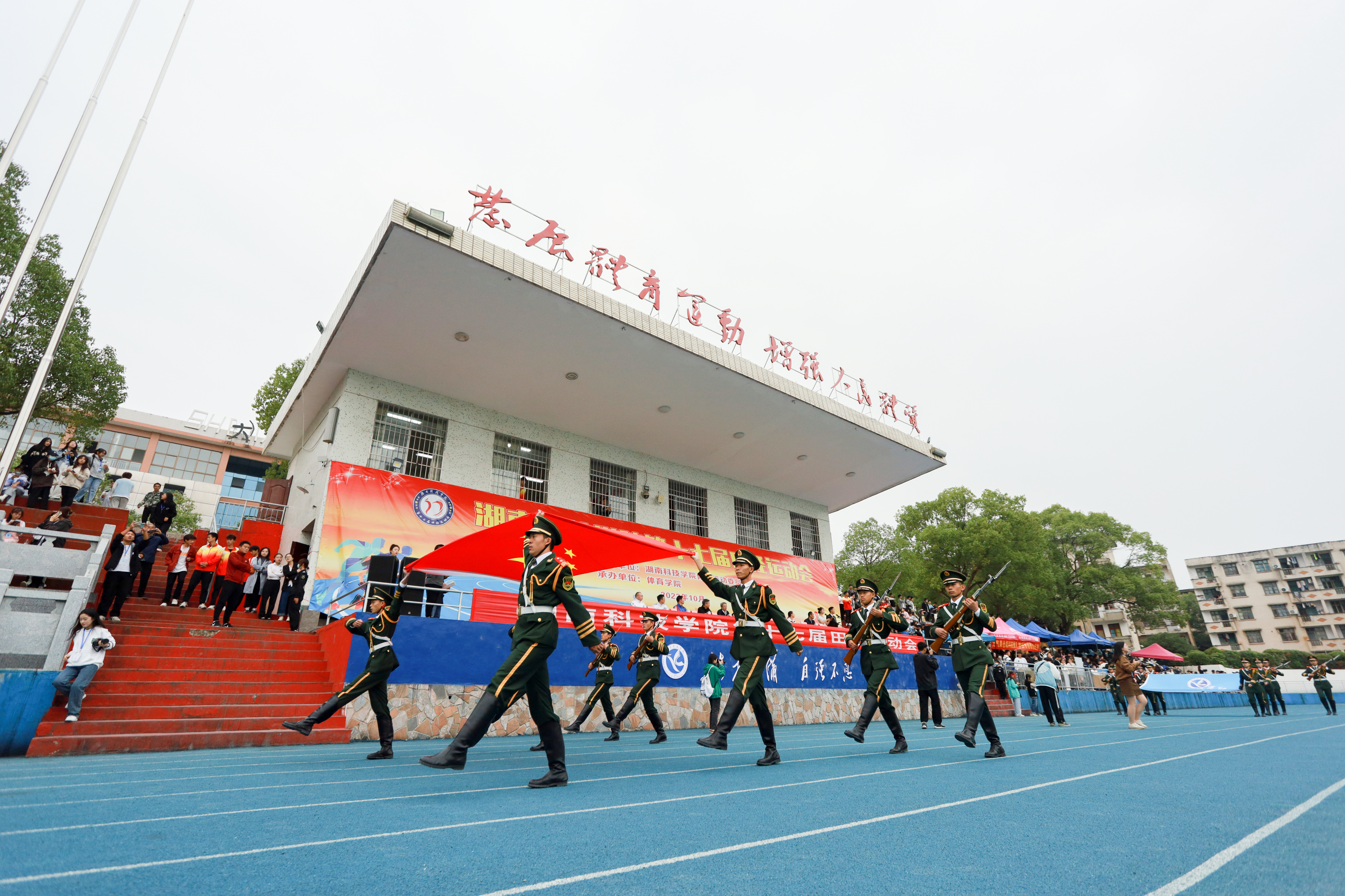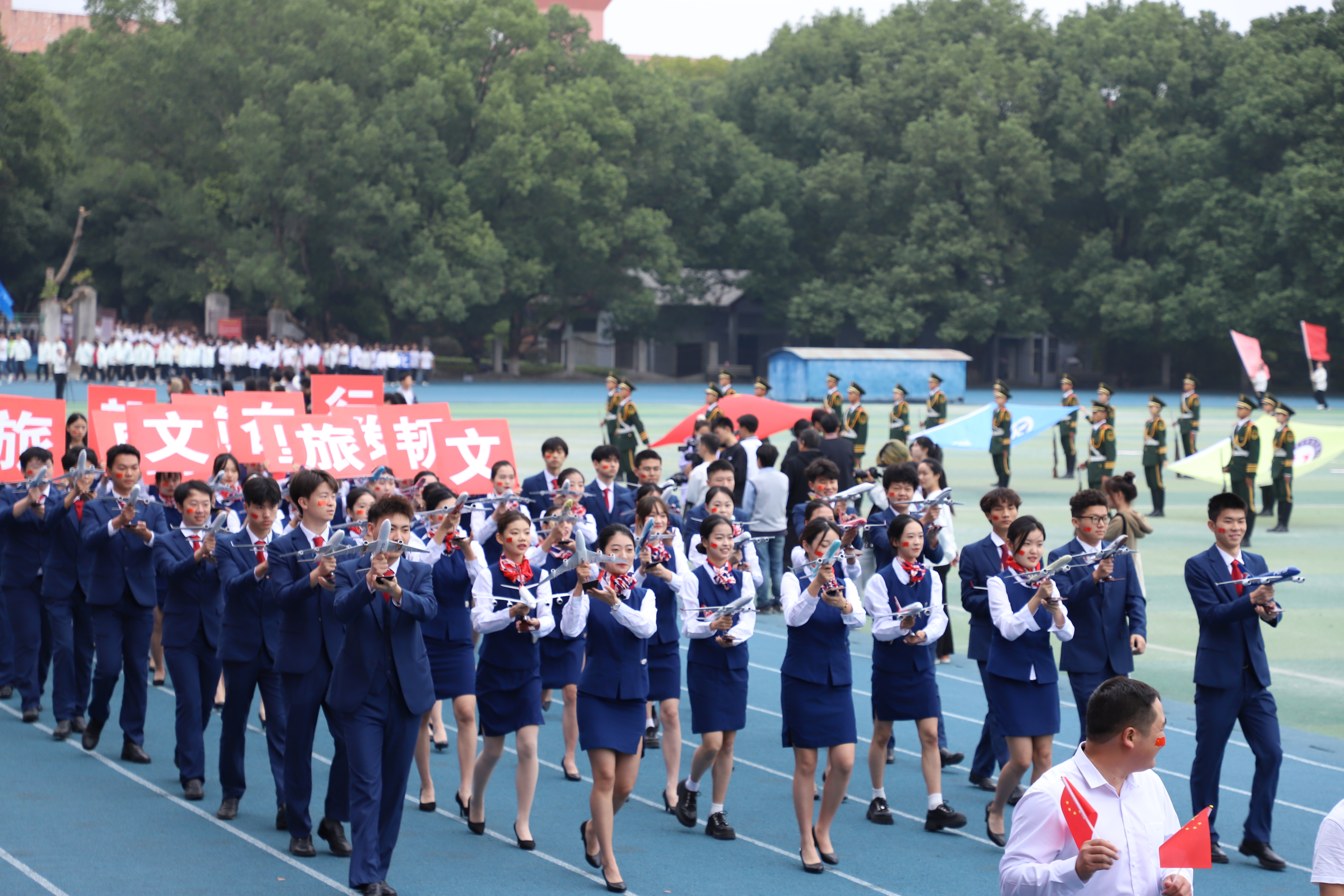 伴随着激昂的运动员进行曲,护旗手们迈着有力的步伐,护送国旗、校旗和会旗经过主席台,乐队、彩旗队、鲜花队、彩球队、学院代表队、教师代表队的方阵紧随而来,运动健儿手持院旗,脚步有力,展现出各教学学院独有的风采。他们以青春的朝气饱满的热情坚定的步伐,显示出科院学子高昂奋进的精神风貌。