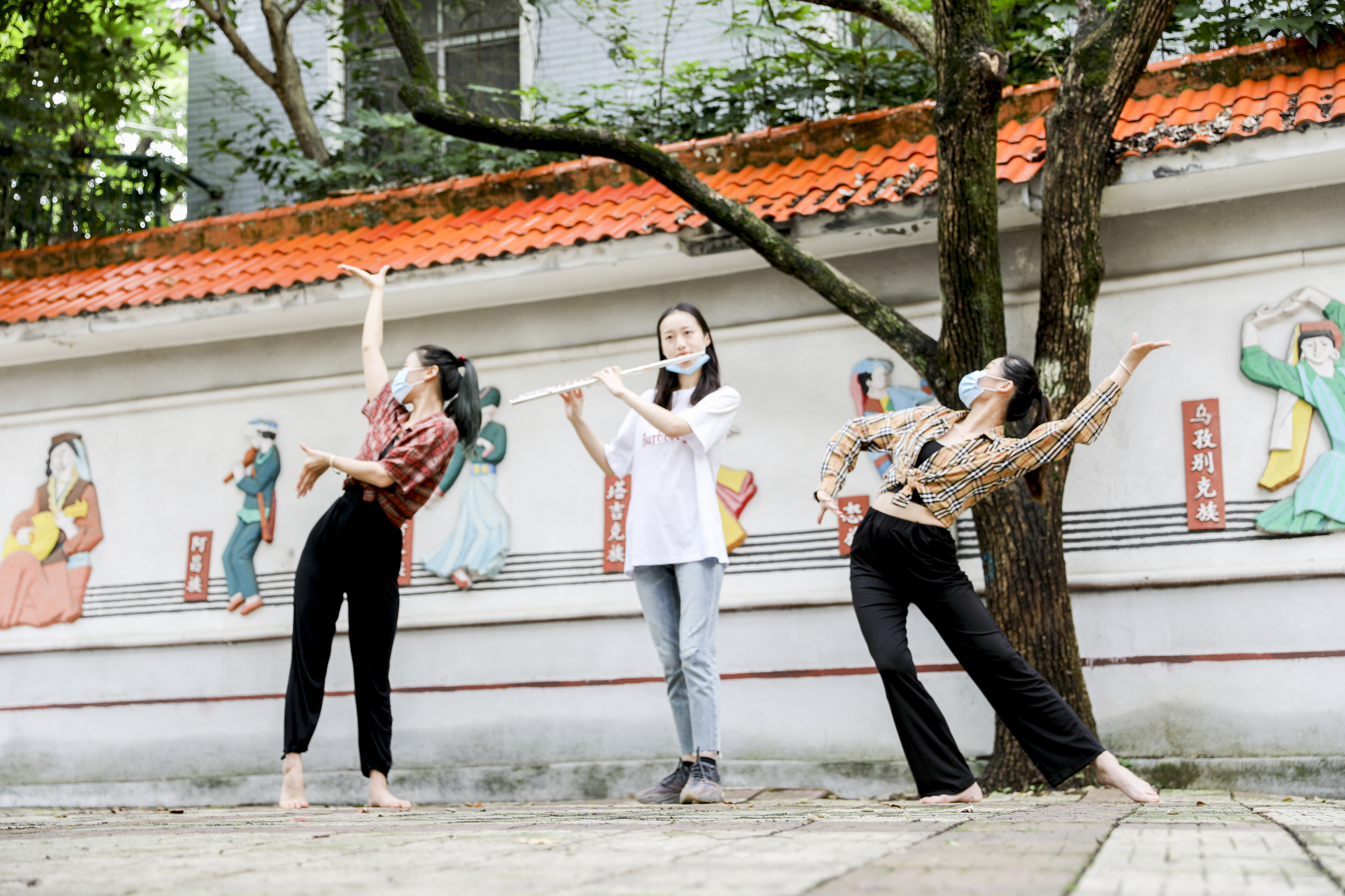 学生在民族墙前练习民族舞