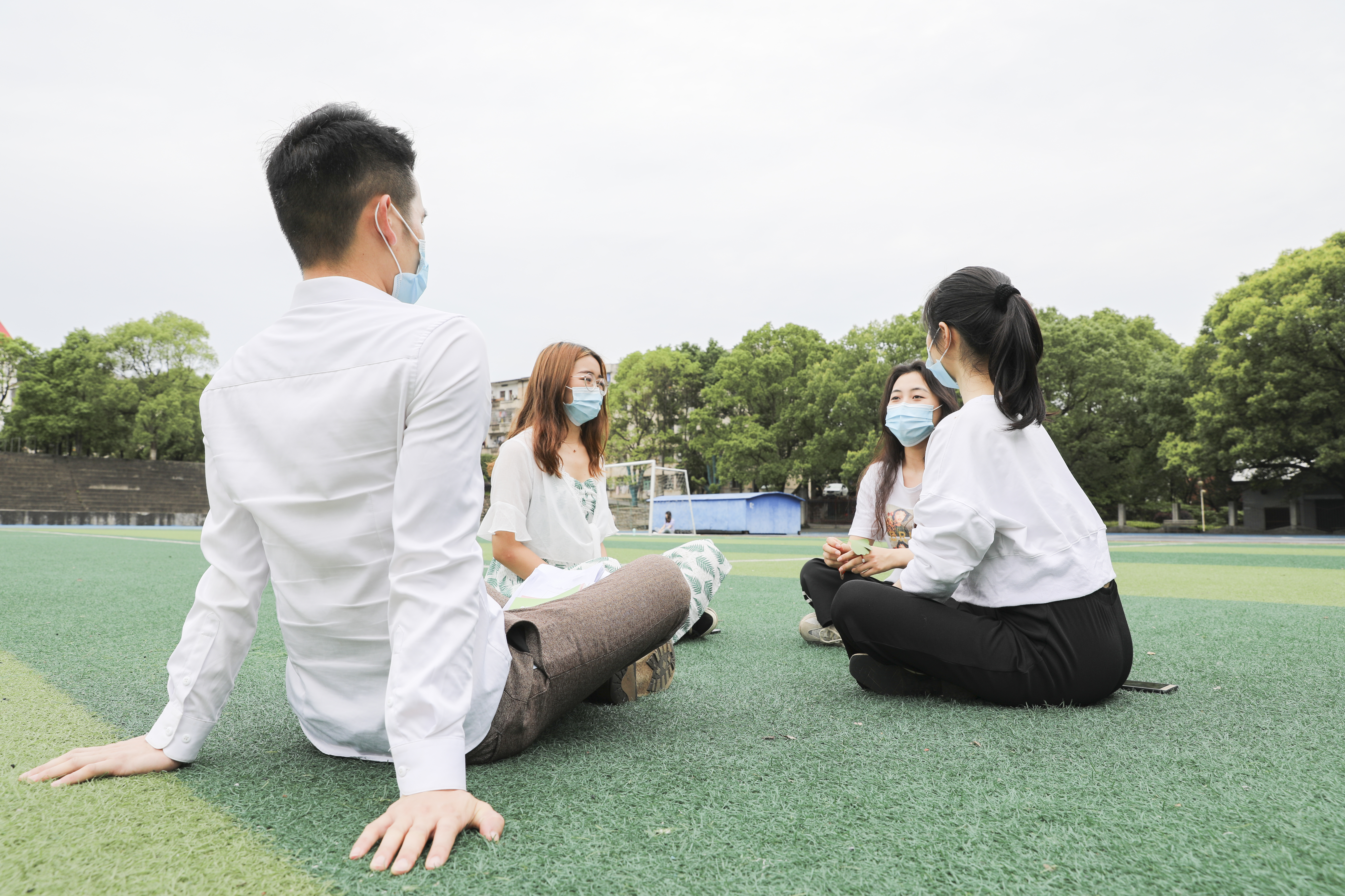 同学们在草坪上闲谈
