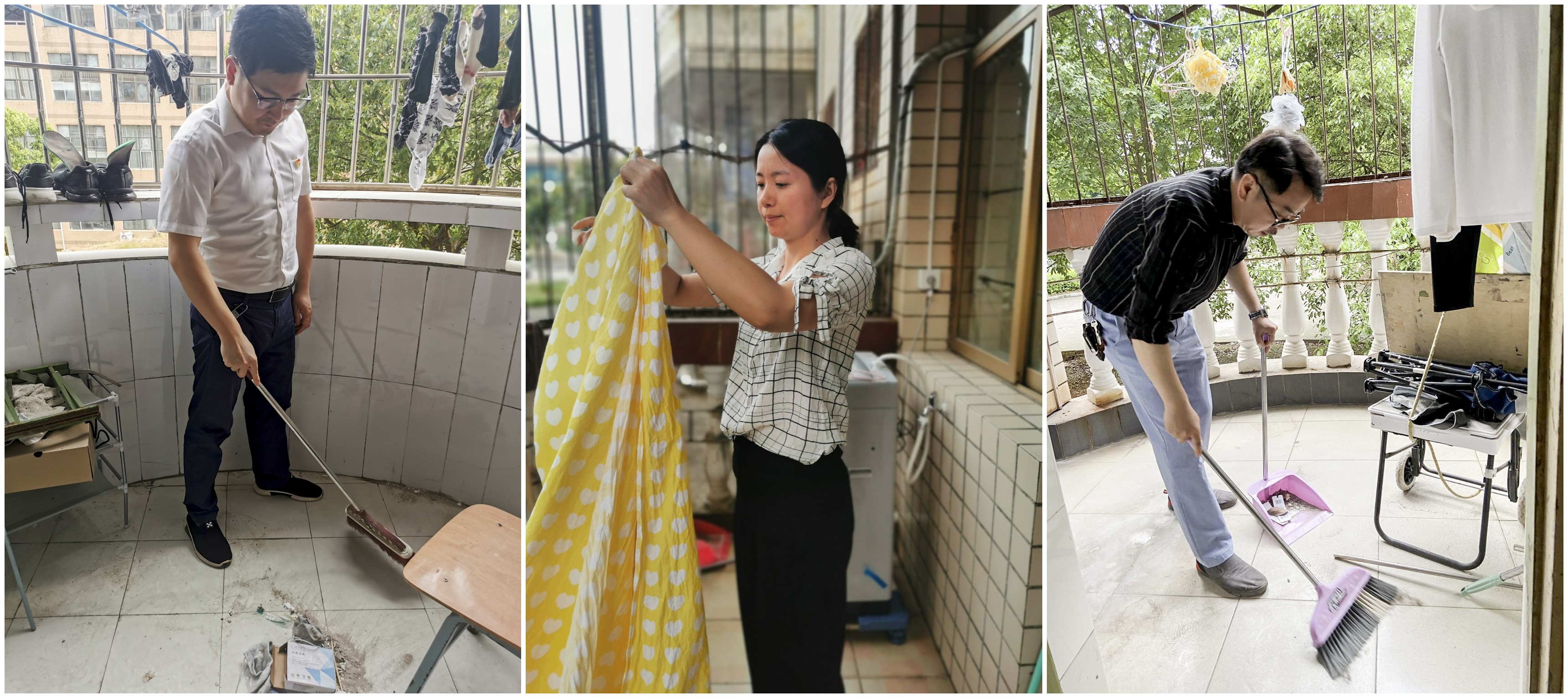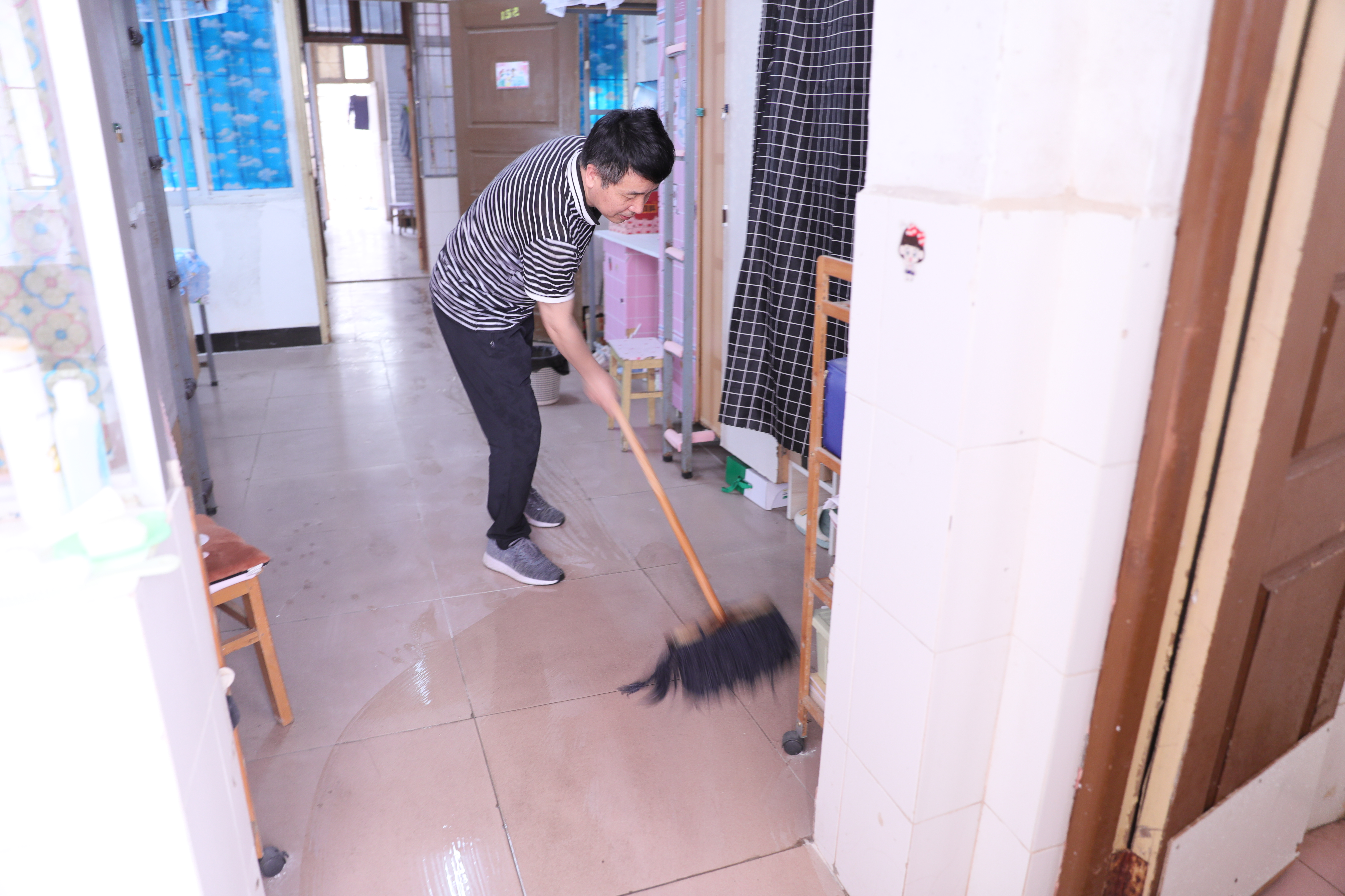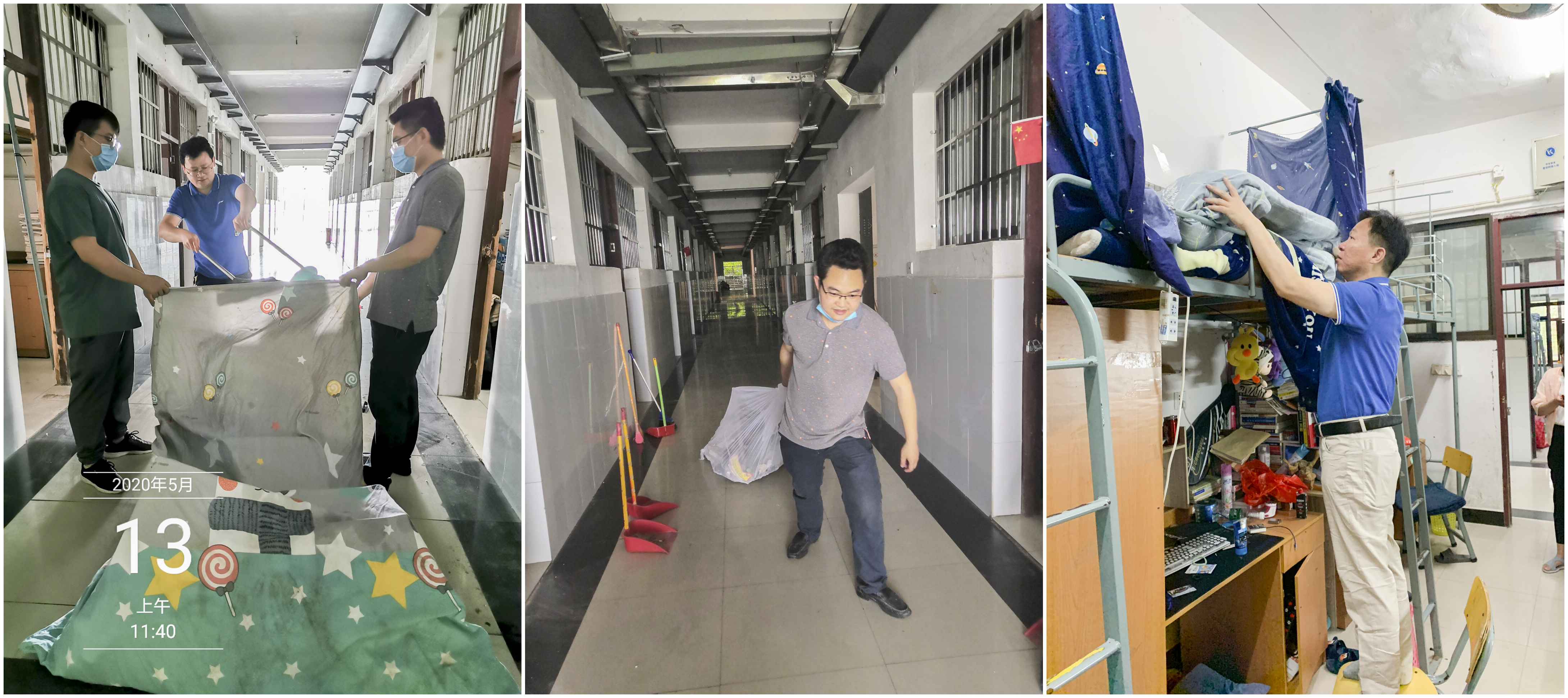 本网讯 近日, 我校上演了一场暖心大行动,各学院的班主任、辅导员纷纷拿起拖把、扫把、清洁剂、地板刷等清扫物品走进学生公寓,进行通风消毒、寝室大扫除、洗床单、晒被子等,做好开学准备工作,迎接学生归来。