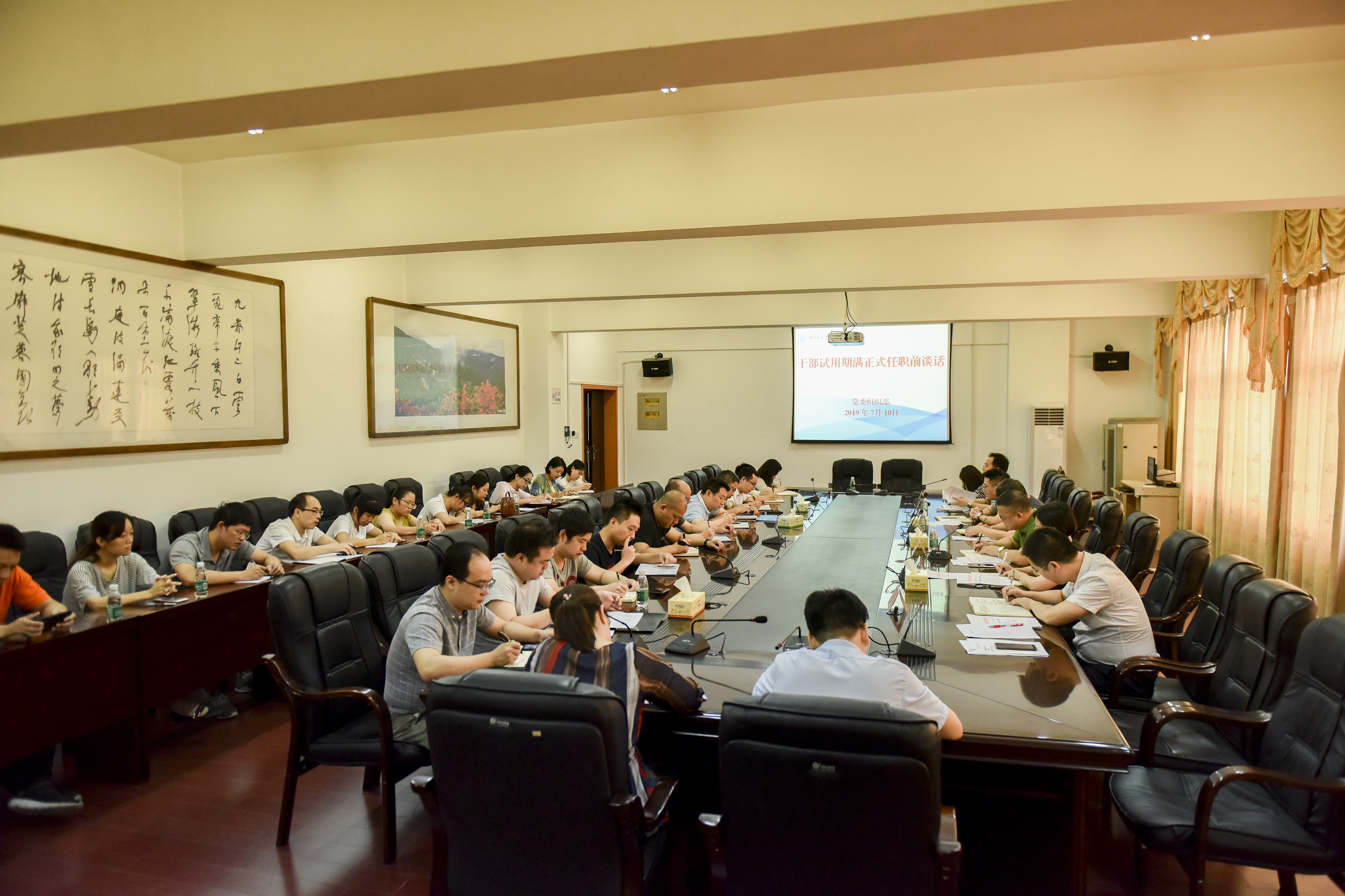 何福林在会上宣布了《关于廖群峰等同志试用期满正式任职的通知》(湘科院组干字[2019]7号)、《关于唐云武等同志职务任免的通知》(湘科院组干字[2019]8号)。廖群峰等34名正科级干部按期转正,唐云武等16名科级干部进行了岗位调整。