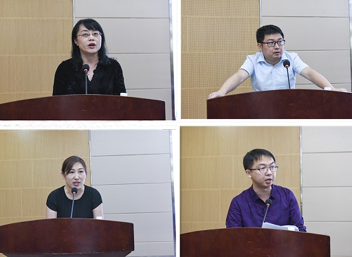 省级特色应用学科专业代表马克思主义学院院长廖雅琴、省级综合改革试点专业代表电子与信息工程学院院长尹向东、省级教学竞赛一等奖代表土木与环境工程学院教师罗雄文、学生学科竞赛优秀指导教师代表美术与艺术设计学院教师夏炳梅先后发言。