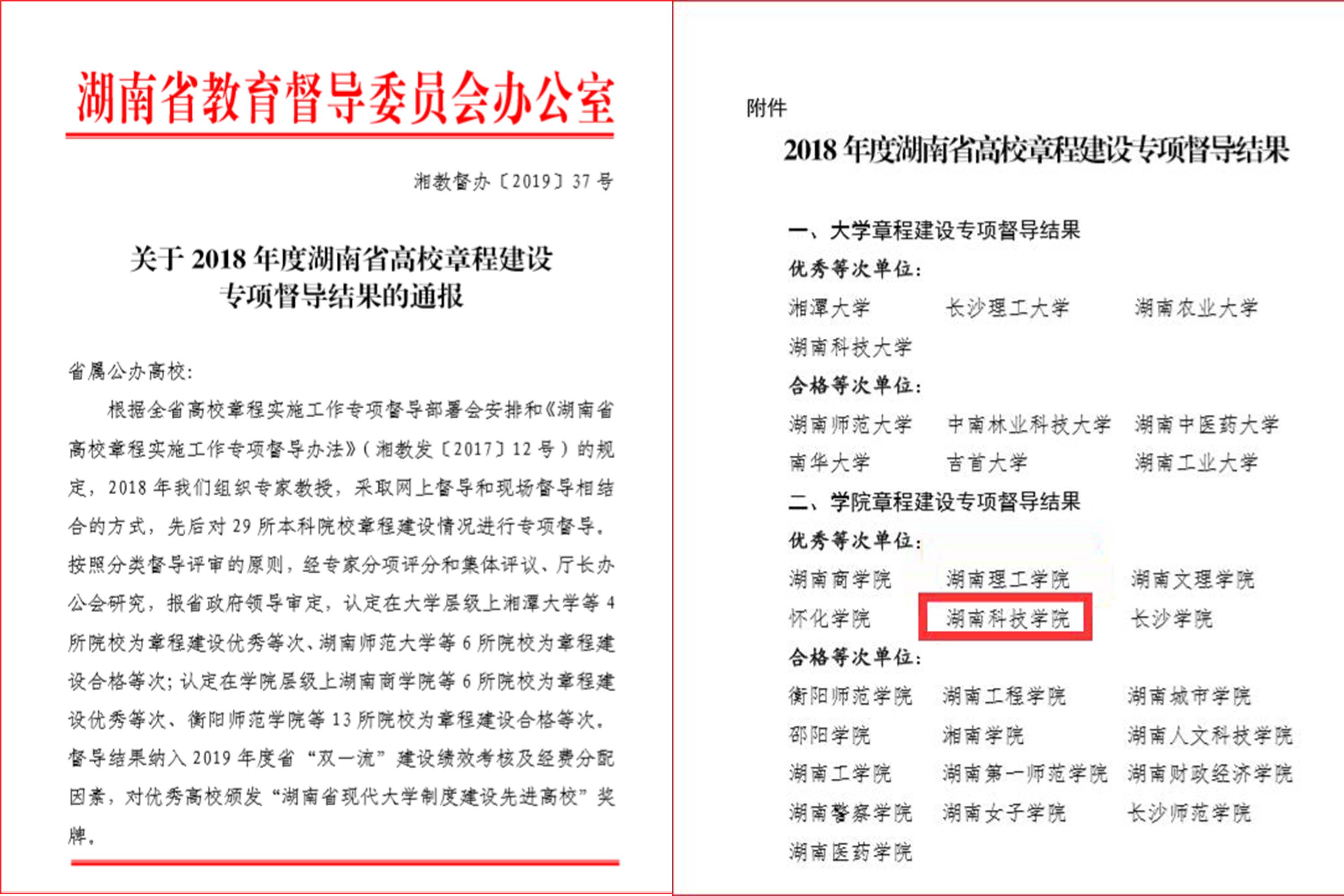 本网讯   近日,湖南省教育厅公布了高等学校章程建设专项督导结果,我校被认定为章程建设“优秀”等次单位,被授予“湖南省现代大学制度建设先进高校”荣誉称号。