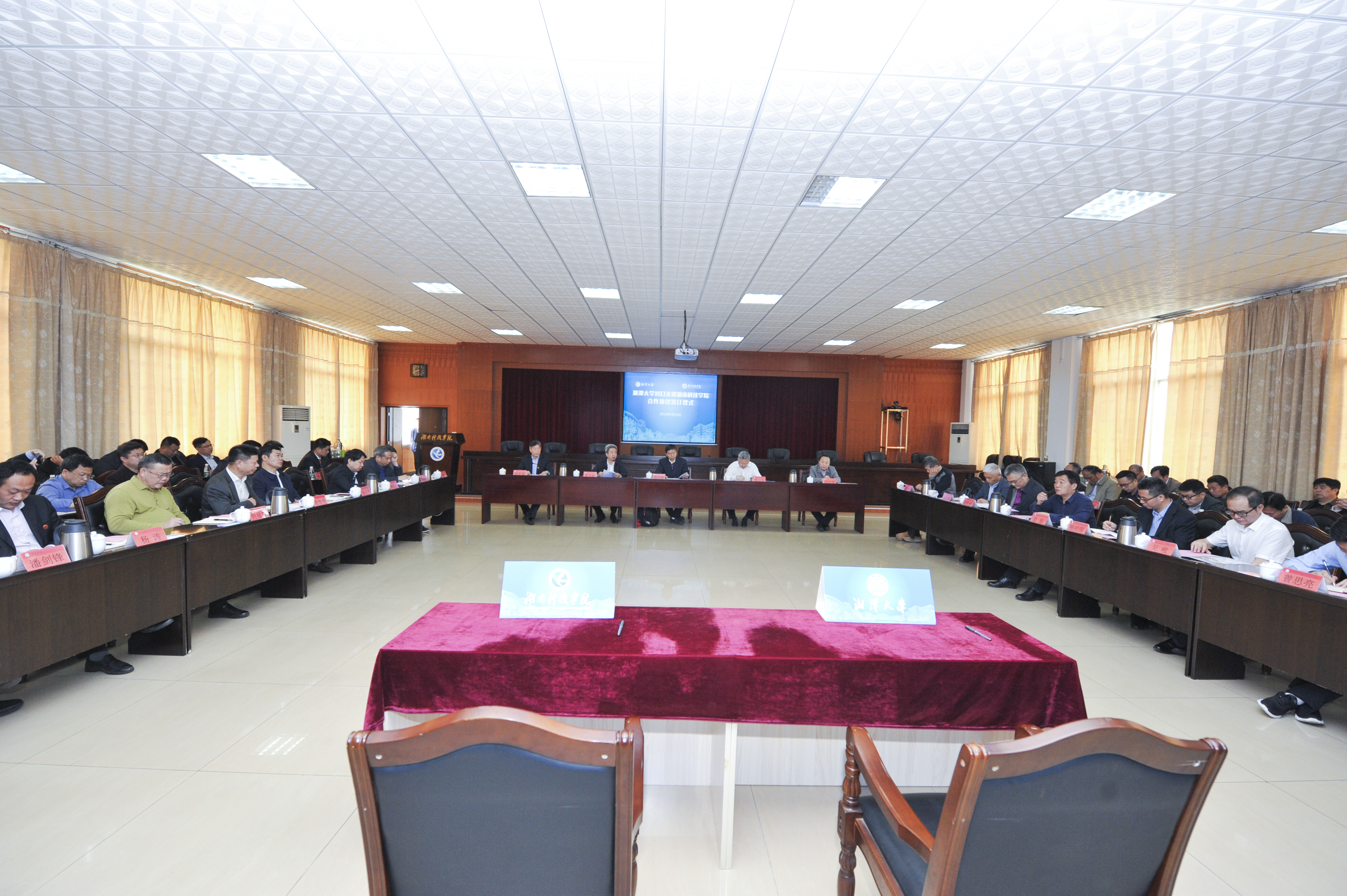 本网讯 晴日暖风生麦气,绿阴幽草胜花时。5月10日上午,湘潭大学与我校举行对口支援签约仪式。省教育厅党组成员、主任督学、副厅长、工委委员唐亚武,省教育厅高教处长曾力勤、科技处长吴跃辉,省人民政府学位委员会办公室主任颜胜利,湘潭大学党委书记黄云清,湘潭大学党委委员、副校长刘长青,我校党委书记、校长曾宝成,校领导唐艳明、宋宏福、郑山明、李常健、吴小林、程智开,学校各教学学院、各职能部门负责人参加仪式。仪式由宋宏福主持。