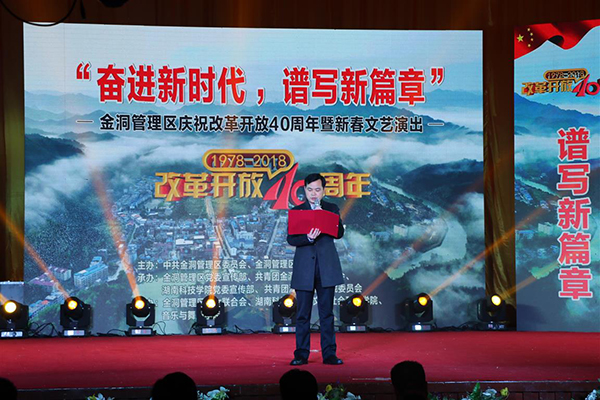 本网讯 1月3日,“奋进新时代,谱写新篇章——金洞管理区庆祝改革开放40周年暨新春文艺晚会”在金洞大会堂举行。活动由金洞管理区党委、管委会主办,由我校党委宣传部、团委和金洞管理区党委宣传部、团区委承办,我校人文与社会科学学院、音乐与舞蹈学院和金洞管理区妇联协办。学校副校长程智开,党委委员、宣传部长杨涛等到会观看演出。