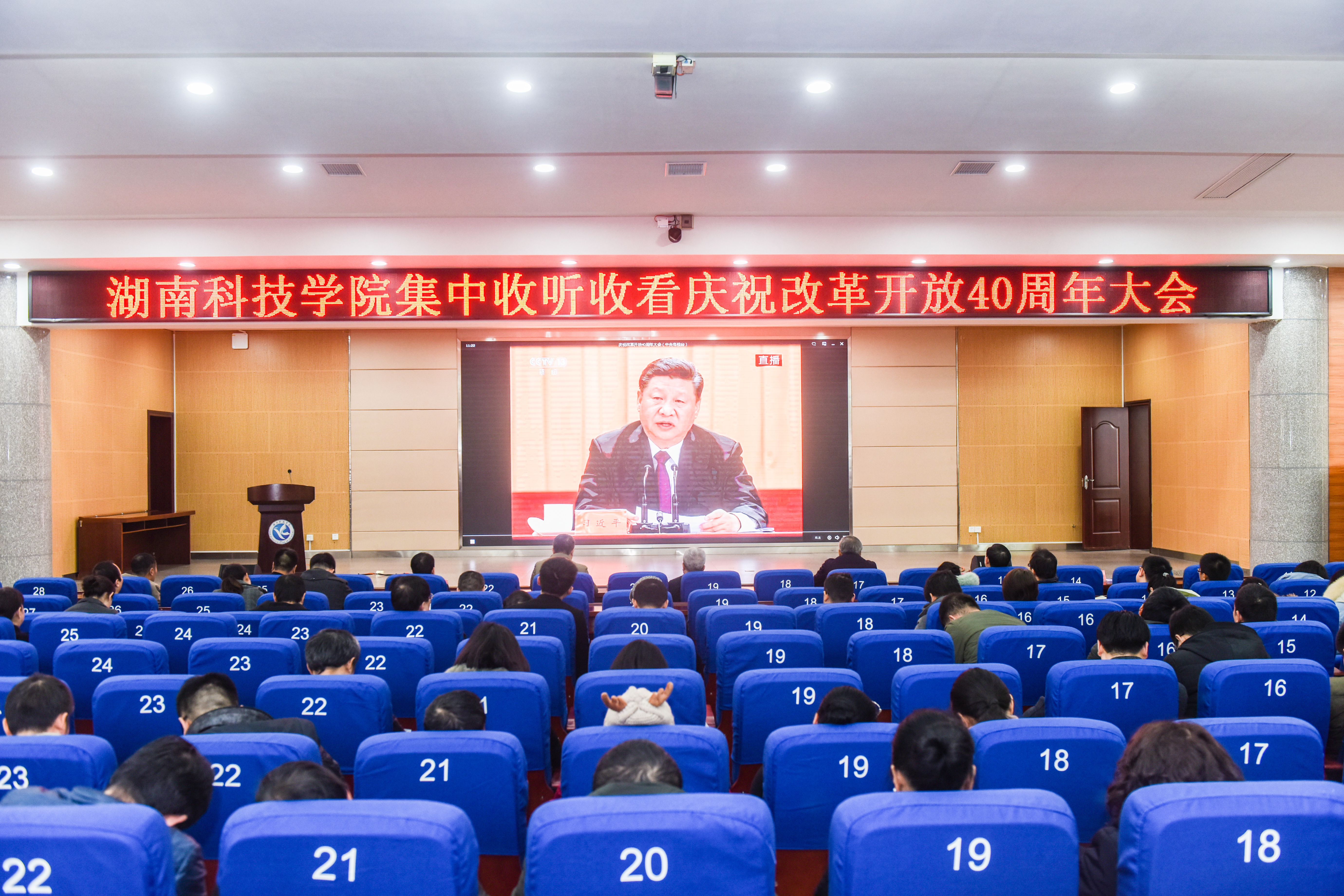 本网讯   12月18日上午10时,庆祝改革开放40周年大会在北京人民大会堂举行。中共中央总书记、国家主席、中央军委主席习近平出席大会并发表重要讲话。为了及时关注大会情况,学校在潇湘大讲堂设立主会场,各学院设立分会场,组织师生们集中收看庆祝改革开放40周年大会直播盛况。校领导曾宝成、唐艳明、宋宏福、郑山明、李常健、吴小林、程智开及师生代表近5000人一同见证了这一历史时刻。