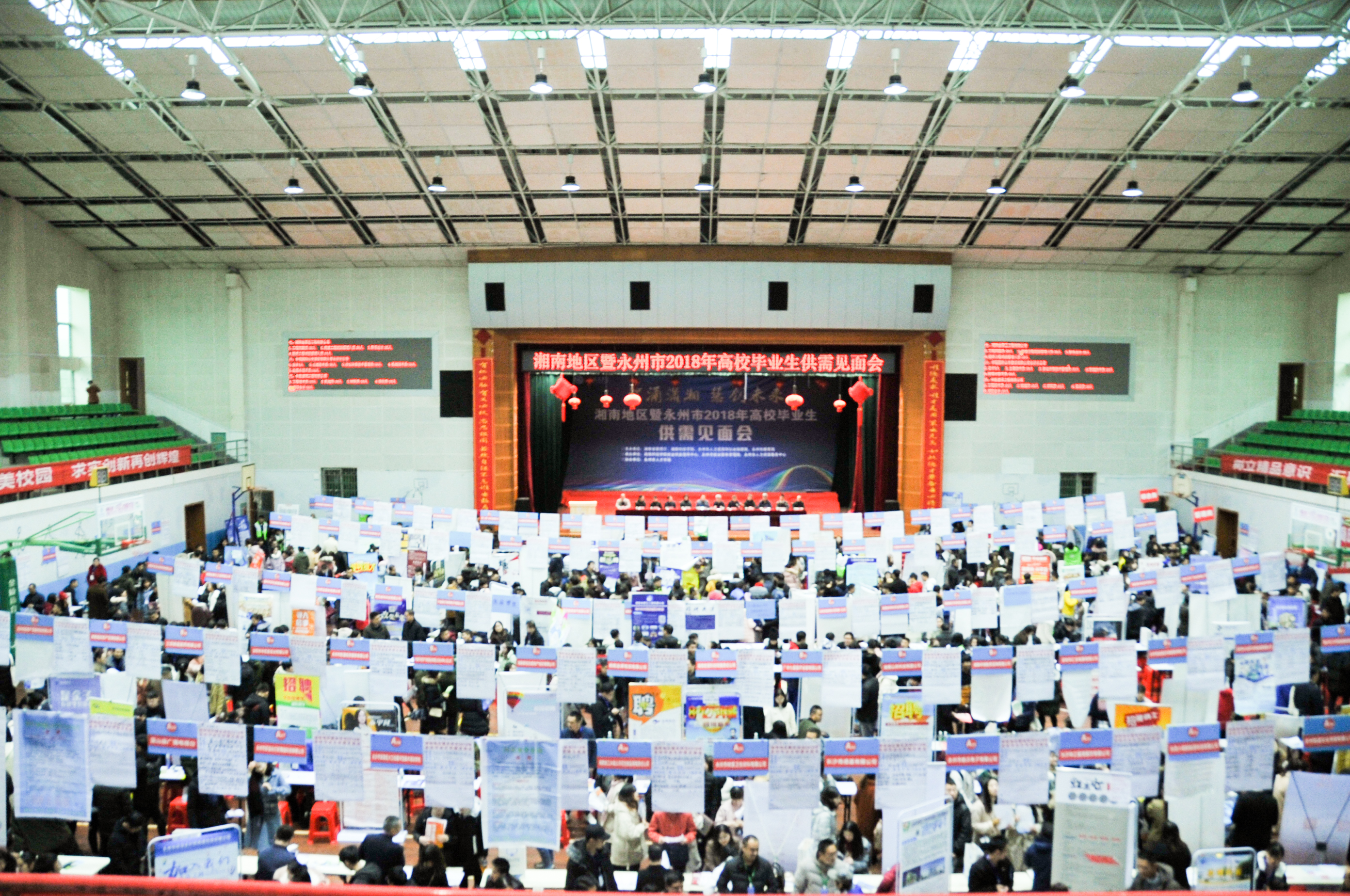 本网讯  千帆竞发,百舸争流。 12月8日,“智涌潇湘,慧创未来”湘南地区暨永州市2018年高校毕业生供需见面会在校体育馆和训练馆举行,吸引了来自校内外的应届毕业生8100人次进场求职。