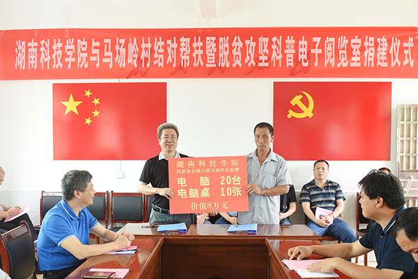 本网讯 6月14日上午,校长曾宝成及校领导唐艳明、郑山明、吴小林带领学校中层干部赴新田县枧头镇马场岭村开展“结对子认亲戚”暨电子阅览室捐建活动,向该村捐赠了20台电脑及电脑桌,总价值八万元,并与该村签订了捐建电子阅览室协议书。