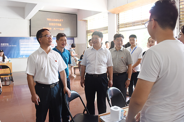 本网讯  9月16日,是我校新生报到第一天。上午8时许,校党委书记陈弘,校长曾宝成及在校领导唐艳明、宋宏福、郑山明、李常健、吴小林、程智开与相关职能部门负责人来到各个学院设立的迎新接待处及迎新服务点,看望并慰问迎新工作人员,与他们一起迎接新生的到来。