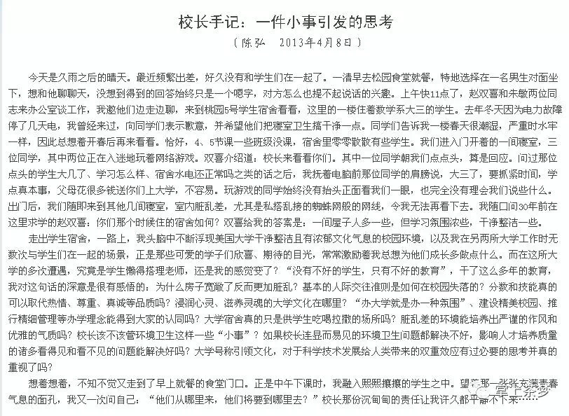 去县城的路上,我的思绪一路飘回了我的大学时代。2011年我考入华体会官方版网站登录入口,陈弘书记就是在那一年调到我们学校当校长的。那时的我,不过是丢到人群里的一粒沙,不,我比沙还渺小。因为高考不得志,因为专业没选好,也因为家庭原因,我十分的迷茫、不安、自卑甚至封闭。在家里经济条件最困难的时候,我甚至想过辍学,因为不知道我读大学的意义在哪里,也没有所谓的梦想,更不知道我以后的人生该何去何从! 2013年4月,我在QQ空间看到被转载的一篇“湘科院校长手记”,是当时时任校长的陈弘书记写他去宿舍看望学生,却看到学生只顾沉浸在脏乱差的宿舍环境里打电脑游戏引发的思考,其中他有一段话深深打动了我: