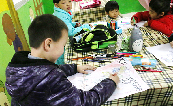 教室里坐满了挥动着画笔的孩子,他们正在学着勾勒、上色,忙得不亦乐乎。秦游涵率先完成了作品,他兴奋地跳了起来,给这个看看,给那个瞧瞧,其他小朋友也不甘示弱,红彤彤的小脸上有着一股执拗的神情,小手攥紧了彩笔,一笔一划的涂上自己喜欢的颜色,红的,绿的,黄的……每一份不同的图画代表了一颗纯真的心。