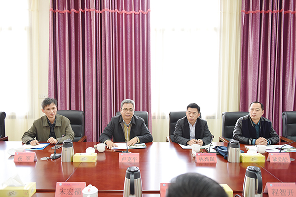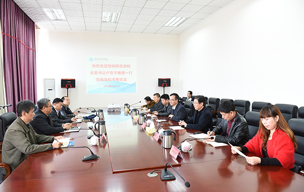 本网讯 12月7日下午,信阳师范学院党委书记卢克平一行来校考察交流。校党委书记陈弘,副校长宋宏福、程智开热情迎接,双方就人才队伍建设、应用型人才培养等相关事宜进行友好会谈。