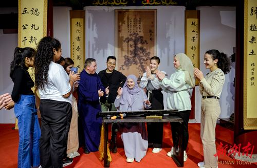 外国学子在和省级非物质文化遗产——九疑琴派第四代传承人欧阳平彪交流学习