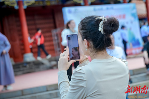 外国学子通过手机视频连线,向家人朋友分享在九嶷山的所见所闻