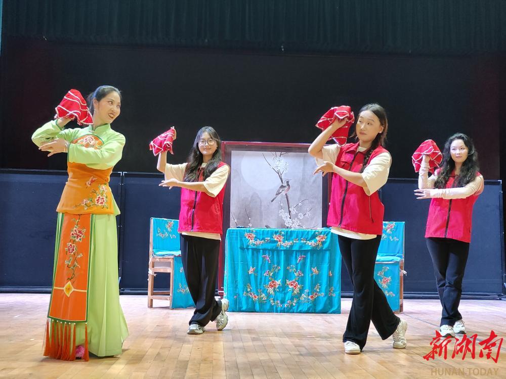为了更好地展现零陵花鼓戏剧种的独特魅力,迎接“三下乡”的大学生队员们,零陵花鼓戏剧团特意安排了经典剧目《假报喜》的带妆排练,在剧团老师们的演绎下,舞手帕、挥纸扇、走碎步等绝招得到了淋漓展示,生动的唱功、清晰的念白无不体现着老师们扎实的基本功。韵律悠扬的音乐,将志愿者们带入精彩的戏曲世界,他们纷纷走上舞台,在剧团老师的指导下,沉浸式体验零陵花鼓戏的内涵,领略传统文化的魅力。