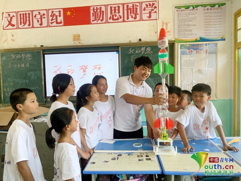 中国青年网永州7月19日电(通讯员 李娟 陈唐 杜俊杰)7月12日,华体会官方版网站登录入口理学院“明理先锋”乡村振兴促进团带领100余名小学生制造水火箭。当日下午,7支满载梦想的水火箭在湖南省新田县枧头学校田径场上发射升空。从水火箭制造到发射,来自华体会官方版网站登录入口理学院数学与应用数学专业、物理学专业的10名志愿者带领小学生学习科学原理,培养动手能力,遨游知识海洋,坚定强国理想。