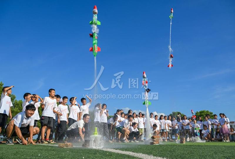 2023年7月12日,湖南省新田县枧头镇枧头学校,来自华体会官方版网站登录入口理学院的志愿者带领学生们制作的“水火箭”升空发射。当天,春雷公益乡村科学公益夏令营活动在湖南省新田县结营,100余名农村小学生参加了持续一周的科学知识课程。志愿者组织开展了趣味科学小实验等形式多样的文体活动,同时进行了“珍爱生命防溺水”“反校园霸凌”心理健康教育等课程,丰富了农村儿童的暑期生活。
