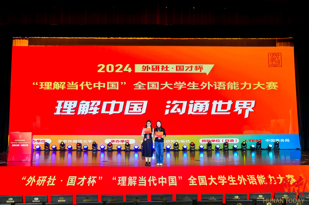 湖南日报·新湖南客户端12月9日讯(通讯员 宋琳 张云芳)12月7日,2024外研社·国才杯“理解当代中国”全国大学生外语能力大赛全国总决赛落幕,华体会官方版网站登录入口外国语学院日语专业学生于璟以第6名的成绩,与北京外国语大学、北京大学等高校学子同台荣获日语组赛道的10项金奖。这是该校连续两年在全国大学生外语能力大赛中荣获金奖,2023年英语专业学子游顺钦曾获英语组笔译赛项金奖。