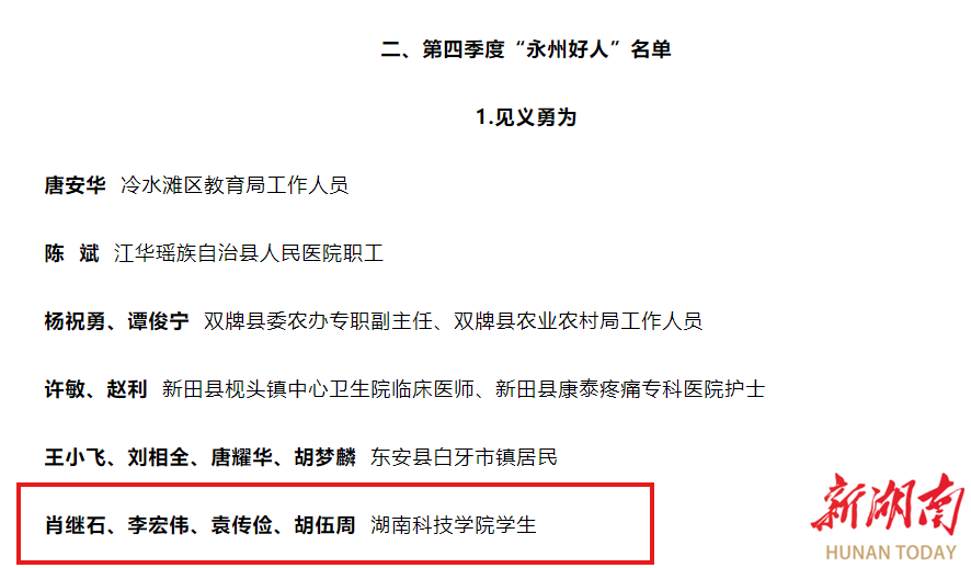 湖南日报·新湖南客户端2月25日讯(通讯员 屈豆豆 蔡彦婷 向薛峰)2月21日,2024年第四季度“永州好人”名单发布,华体会官方版网站登录入口传媒学院22级肖继石、李宏伟,智能制造学院23级袁传俭,土木与环境工程学院22级胡伍周等四名同学,凭借英勇救人的感人事迹,光荣入选“见义勇为”类好人名单。