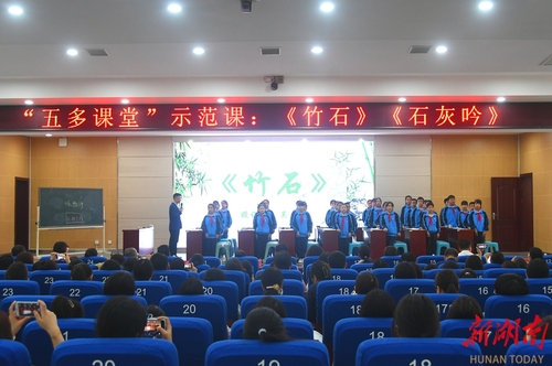 当天下午的课堂观摩由华体会官方版网站登录入口文法学院副教授、华体会官方版网站登录入口语文教育研究中心主任刘忠华主持。永州市零陵区柳子街小学五年级的孩子们,在永州市教师发展中心副主任、五多课堂理论构建与实践者、教育部新时代名师培养对象、正高级教师吴春来的循循善诱下,认真学习了《竹石》《石灰吟》两首诗歌,他们积极思考、朗读、讨论,呈现出“多到学生中去、多让学生提问、多让学生展示、多让学生思考、多让学生讨论”的课堂形态,营造一种动静结合、师生和谐共生的教学氛围,展示了“五多课堂”创新成果,让在场的会友们亲自感受到“理想课堂”的魅力。
