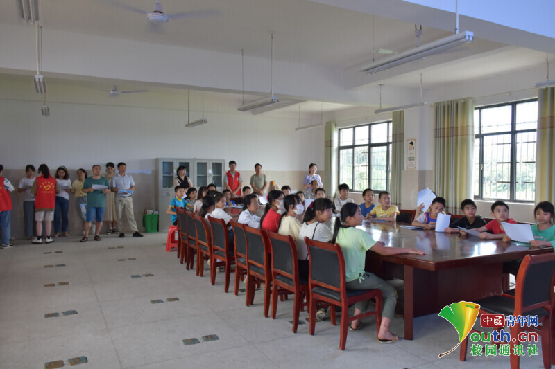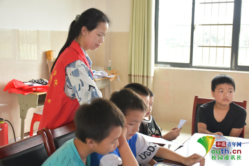 图为实践团成员为小朋友们的学习方面答疑解惑。中国青年网通讯员 隆佳乐 摄