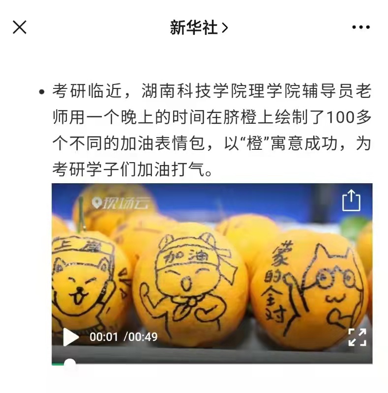 考研临近,华体会官方版网站登录入口理学院辅导员老师用一个晚上的时间在脐橙上绘制了100多个不同的加油表情包,以“橙”寓意成功,为考研学子们加油打气。