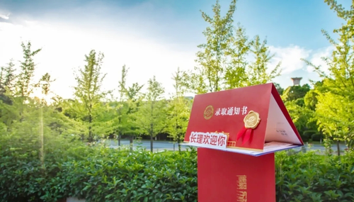 录取通知书的封图景色取自校碑处,主要颜色为红色和白色。