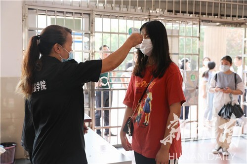 演练中,返校学生佩戴口罩按指示标识排队等候进校,每人间隔1.5米。经值班辅导员引导到“入校通道”,接受健康码核验,显示为绿色且无中高风险地区旅居史的学生,即可至东大门体温监测区进行体温检测,体温正常者可有序进校。如中高风险地区旅居史的学生,还需出示开学前7天内的核酸检测健康报告或相关的健康材料。