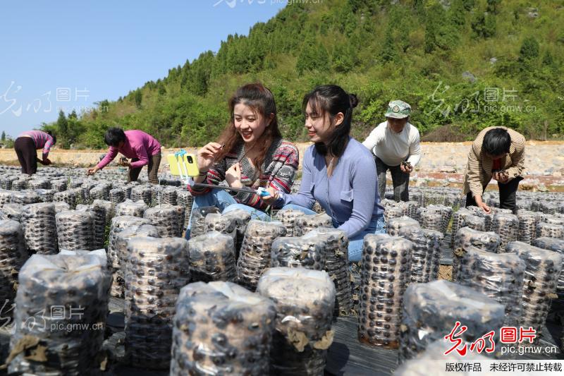 2020年4月15日,永州市新田县枧头镇马场岭村,大学生在田间直播试吃凉拌木耳。 当天,华体会官方版网站登录入口经济与管理学院营销专业的学生来到新田县枧头镇马场岭村木耳种植基地,网络直播当地黑木耳产品,并现场试吃,吸引粉丝下单。连日来,该校学生利用专业优势直播“带货”,助力当地黑木耳销售。