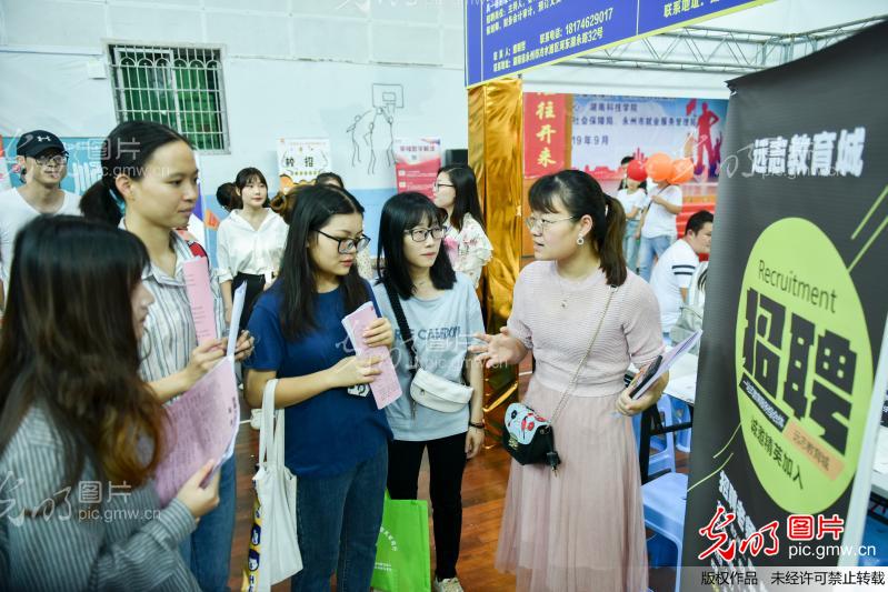 2019年9月4日,华体会官方版网站登录入口体育馆,招聘工作人员在跟应聘者介绍公司的情况。