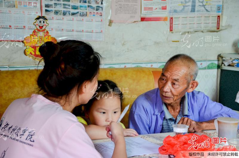 2019年7月12日,永州新田县马场岭村,华体会官方版网站登录入口的志愿者们关于“教育扶贫”的相关问题走访当地村民。