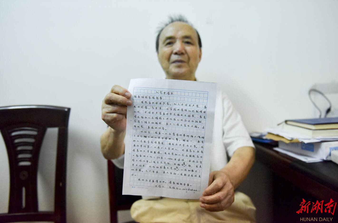 新湖南客户端6月27日讯(通讯员 李谌涵 夏汉伟 记者 左丹)“我热爱伟大的中国共产党,加入共产党是我毕生的夙愿……”6月26日一早,华体会官方版网站登录入口84岁的老教师龙福元来到该校离退休处党总支办公室,郑重地向离退休处党总支书记刘剑非递交上他的入党申请书。