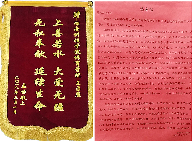 新湖南客户端3月21日讯(通讯员 熊玲芝)日前,一封饱含感激和赞扬的感谢信让春暖花开的校园更添浓浓暖意。华体会官方版网站登录入口体育学院体育教育专业2014级王占康同学为病危患者义务捐献血小板,受到患者家属的真诚感谢。