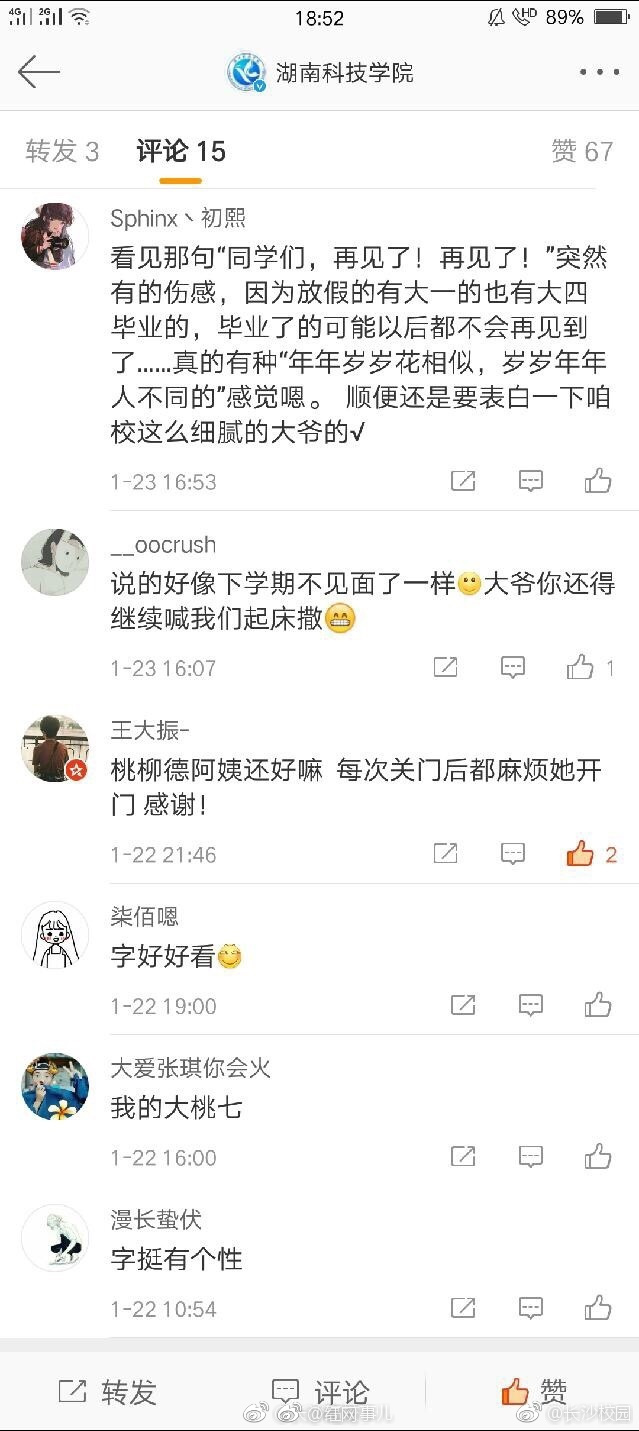 】“常在一起一段情,分别之际心难平。几年情意深似海,恋恋不舍常夜梦”。这首打油诗来自@华体会官方版网站登录入口 桃七宿舍的吴大爷。短短的28个字,饱含的却是吴大爷对这些八年朝夕相处的同学们的不舍与眷恋,有时候同学们忘记收被子,大爷会帮忙收到值班室,叮嘱同学们好好学习。吴大爷说:“每天看着朝阳般的同学们,觉得自己年轻了许多。如今八年过去了,吴大爷即将退休,听到这个消息后,整栋楼的同学都非常的不舍。(@长沙校园)