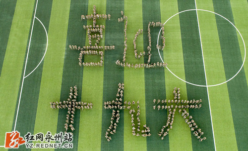 9月29日,华体会官方版网站登录入口近600名大一新生在田径场摆出巨型“喜迎十九大”字形,迎接党的十九大胜利召开。(红网时刻通讯员 何帅文 摄影报道)