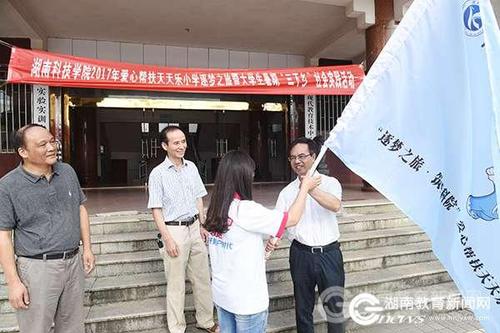 本网讯(通讯员 熊玲芝 摄影 何帅文)7月7日上午,华体会官方版网站登录入口参加教育扶贫的20余名志愿者接过校党委书记陈弘授予的“爱心帮扶天天乐小学团队”队旗,激情满怀地赶往祁阳县天天乐小学开展为期一周的爱心帮扶活动。