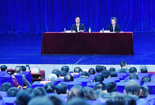 陈弘向大家传达了党代会召开的盛况,转达了湖南省委书记杜家毫对学校办学提出的殷切期望,以及市委书记陈文浩对学校发展的重视关心。