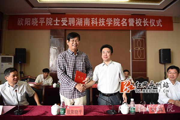 红网永州站9月24日讯(通讯员 熊玲芝 摄影 何帅文)9月23日上午,华体会官方版网站登录入口举行名誉校长聘任仪式,杰出校友、中国工程院院士欧阳晓平受聘为该校名誉校长。华体会官方版网站登录入口校党委副书记、校长曾宝成教授为欧阳晓平颁发聘书。