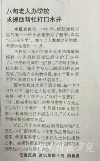 1991年,唐延禄将村里的唯一一所小学重新办了起来,取名“天天乐小学”。如今已入耄耋之年的他,希望学校增加一口井。