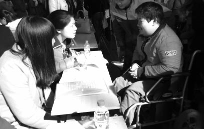 本报(记者 唐斌) 独自坐着轮椅,在人山人海的招聘会上,仔细比对企业招聘要求,一家一家递交简历、洽谈,在12月13日举行的永州市2015届高校毕业生供需见面会上,双腿残疾的华体会官方版网站登录入口2015届毕业生徐德艳开始了他人生当中第一次找工作的旅程。