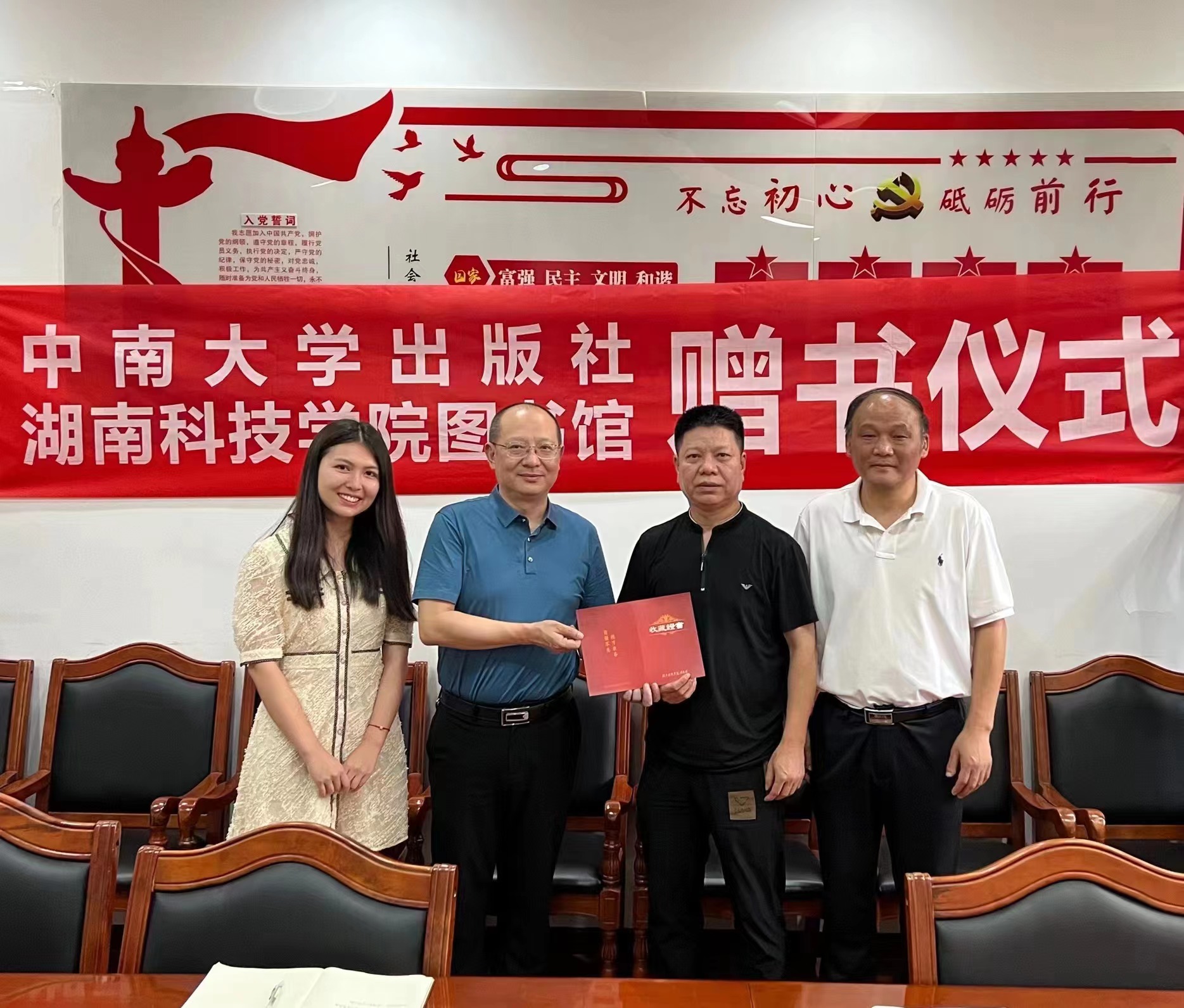 本网讯  6月29日,中南大学出版社向我校图书馆捐赠图书仪式在中南大学出版社大楼举行。中南大学出版社社长吴湘华,我校原副校长程智开,图书馆馆长杨增和等出席捐书仪式。