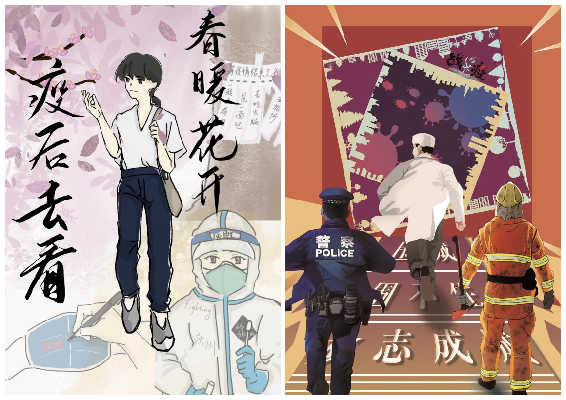经过初赛,本次共有24个作品参加角逐。同学们采用朗诵、演讲、视频的方式来对海报创作进行讲解,阐述构思创意。作品《疫后去看春暖花开》以动漫的方式,巧妙融入了学校的防疫政策,倡导大家主动遵守有关要求,等疫情早日散去,再相约去看春暖花开。作品《夏花将灿 雾尽风暖》用丝丝柳枝期望疫去病散,用朵朵桃花展望美好未来。作品《众志成城》表现了疫情当前,医护人员、警察、消防等冲锋在前,他们为守护大家的生命安全,舍生忘死,也展现了中国人民战胜疫情的坚强决心。