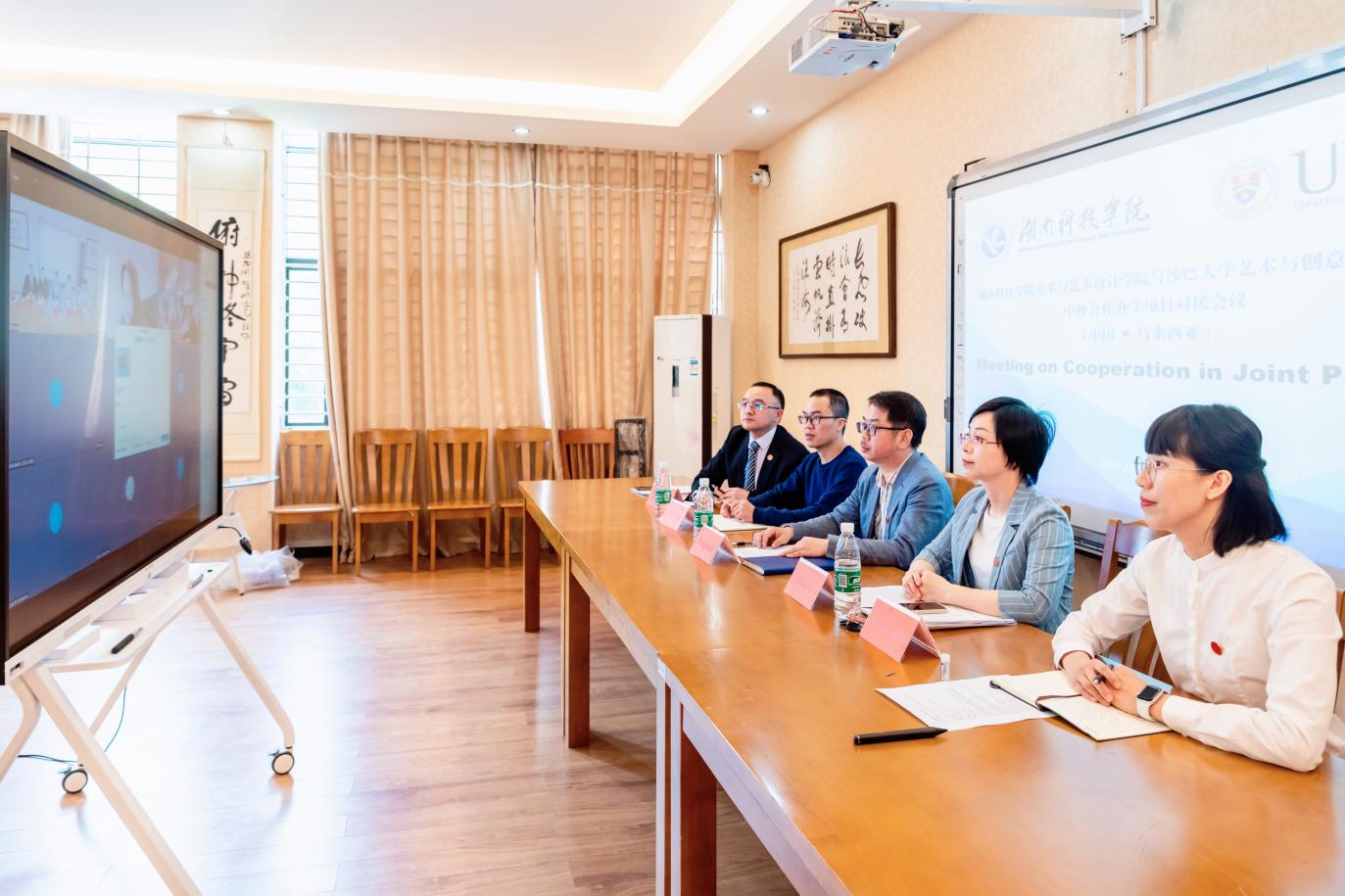 本网讯 4月11日上午,美术与艺术设计学院与马来西亚沙巴大学艺术与创意技术学院开展视觉传达设计专业合作办学项目举行了视频会议,国际交流处处长何丽萍、美术与艺术设计学院院长张建利、副院长柏小剑等参加会议。