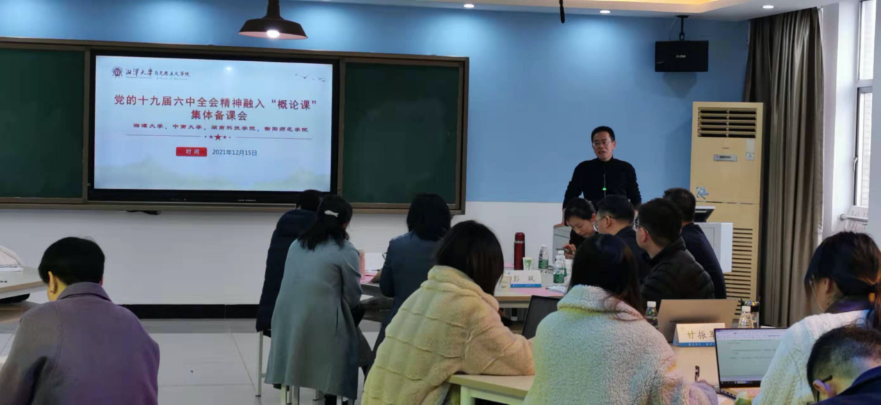 我校马克思主义学院院长廖雅琴表示,双方整合优势资源,优势互补,进一步深化在师资队伍建设、学科水平提升、学位点建设、教育教学改革、高层次科研成果发表等方面的对口协作,并期待在湘潭大学马克思主义学院的对口协作下推动我校马院的高质量发展。 当天下午,湘潭大学、我校马克思主义学院及衡阳师范学院等教师代表联合中南大学马克思主义学院教师代表,就党的十九届六中全会精神更好的融入《毛泽东思想和中国特色社会主义理论体系概论》课程进行了线上线下一体化集体备课。