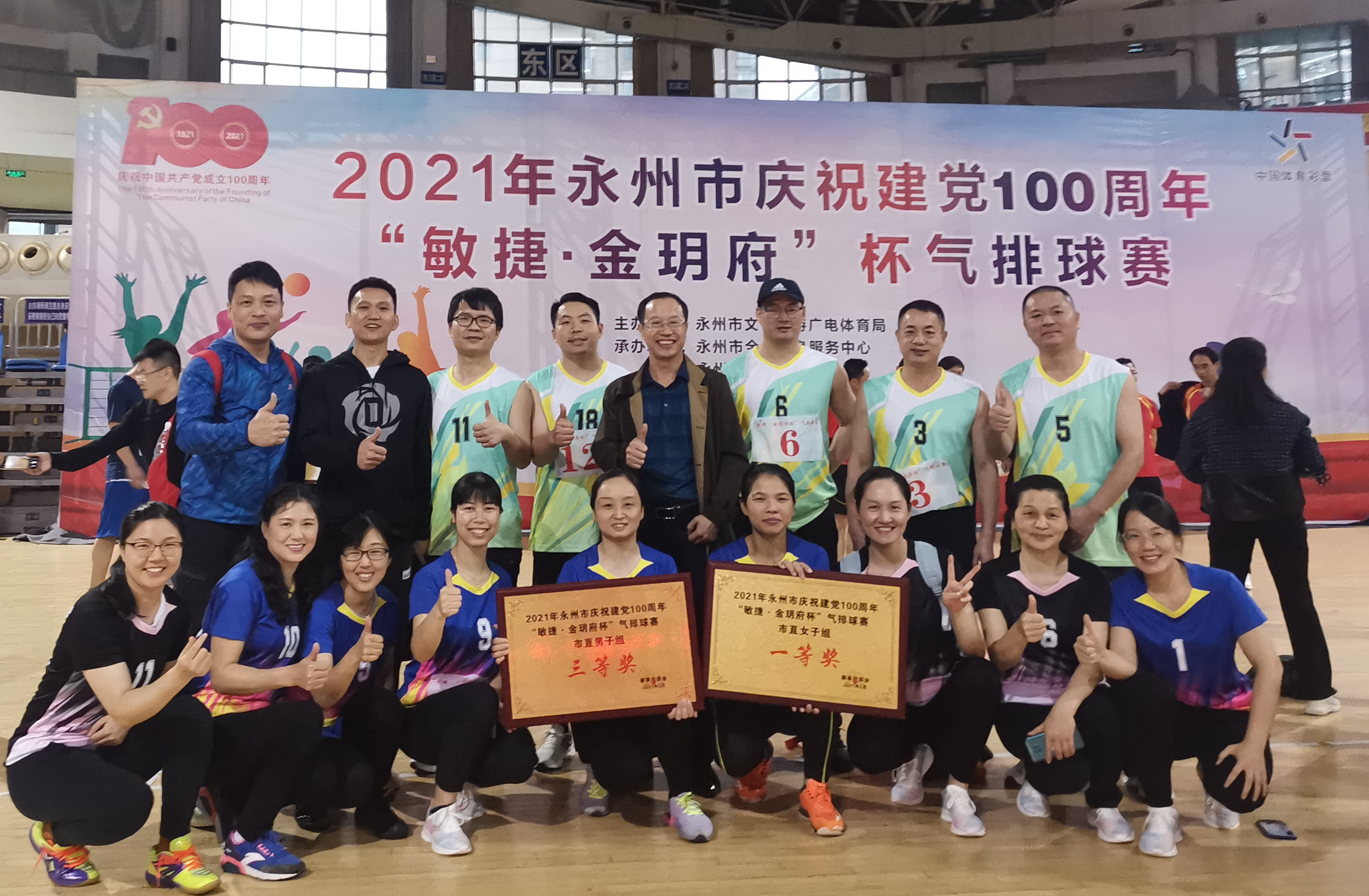 本网讯 5月19日下午,2021年永州市庆祝建党100周年气排球赛在市体育中心落下帷幕,我校女子气排球队荣获市直单位组冠军,男子气排球队获得三等奖。